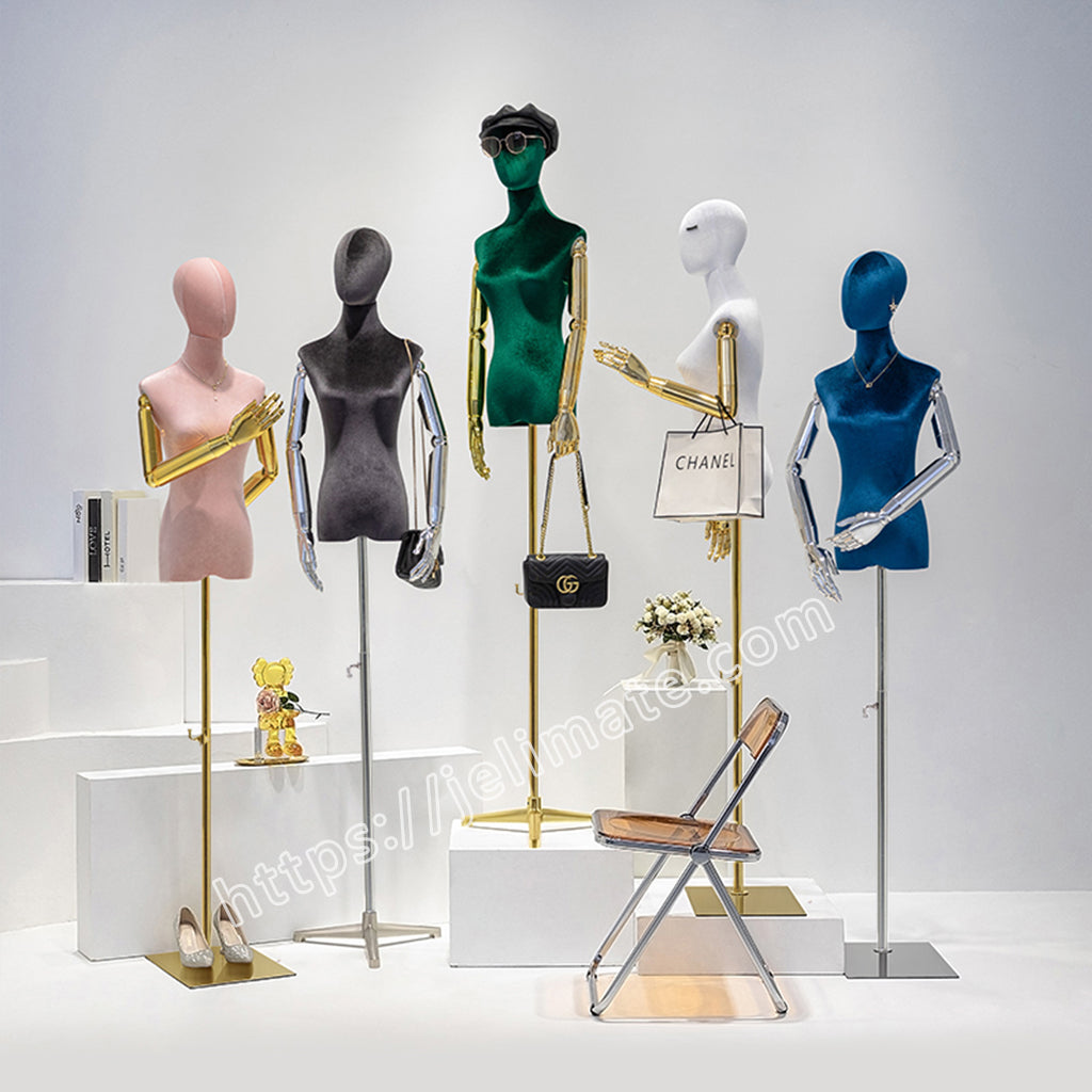 Now, in 2022, we have moved away from the traditional sticker model, as well as we have the new fashion flocking velvet display mannequin with electroplated golden arms instead of normal old Vintage Style