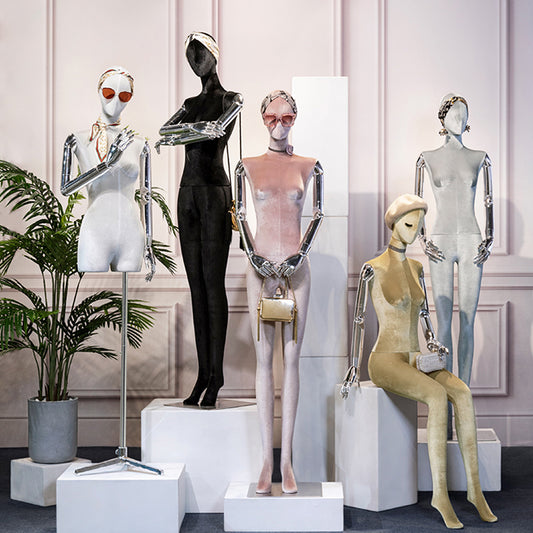 Available in a variety of materials such as fiberglass, plastic, and foam, and dressed in fabrics like linen, suede, satin, or velvet, each mannequin combines durability with aesthetic flexibility to match your brand's visual style.
