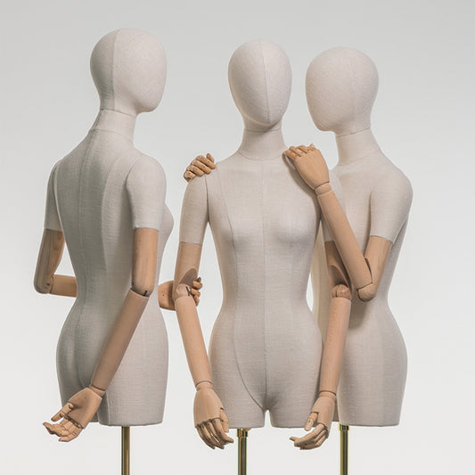 Adjustable Female Half-Body Mannequin with Linen Cover and Wooden Arms for Clothing Display