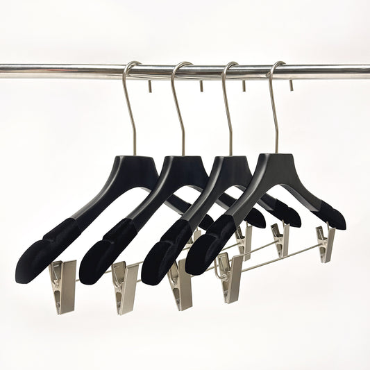 Clear acrylic hangers offer a sleek, high-end look, while plastic hangers are affordable, versatile and moisture-resistant. Both options help keep garments in shape for a neat and professional display.