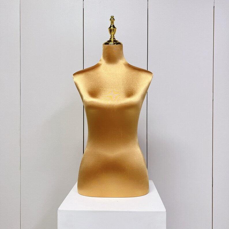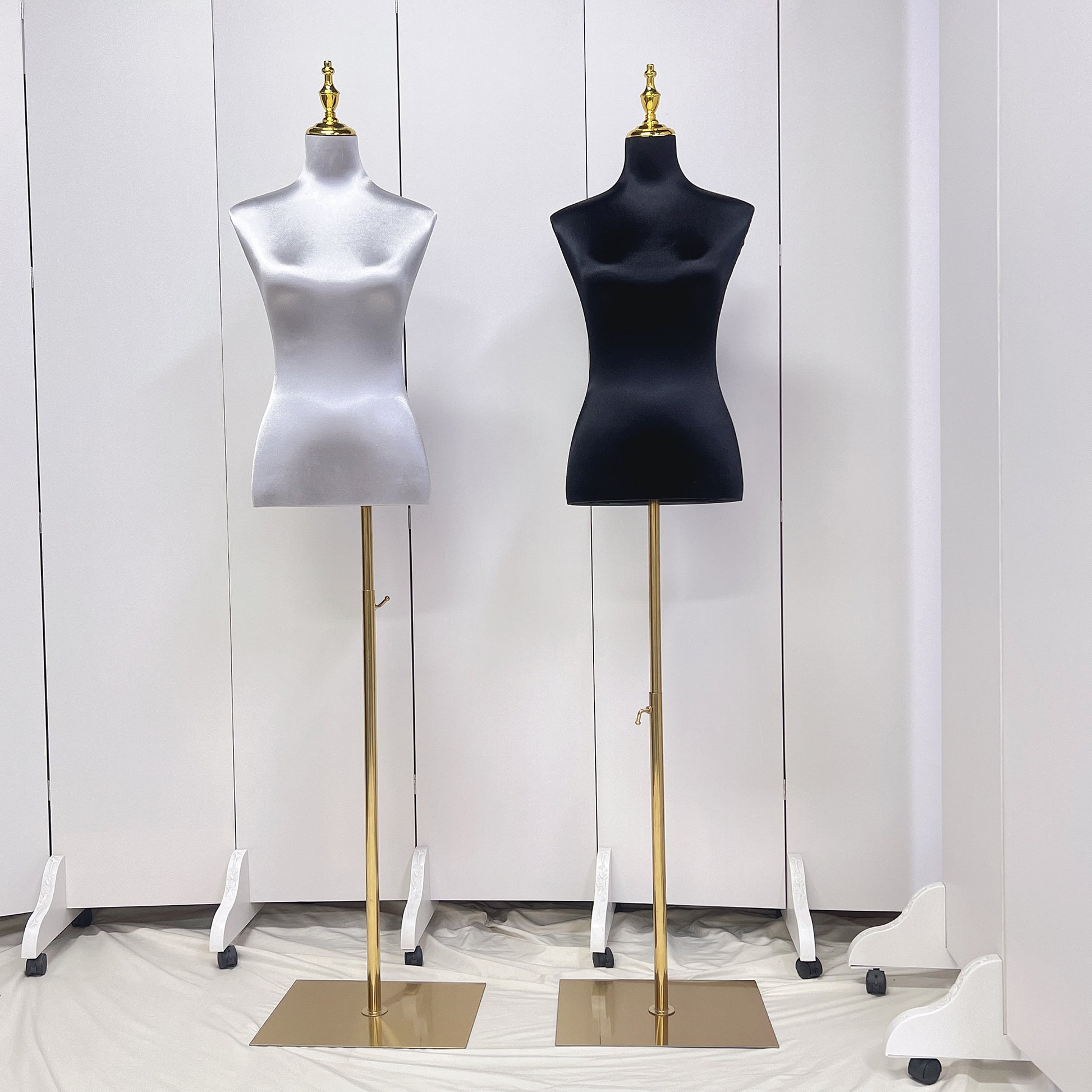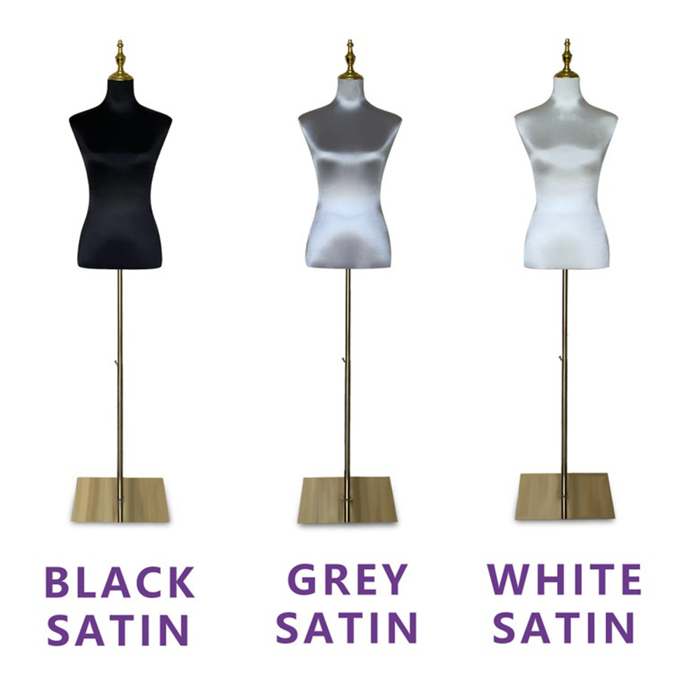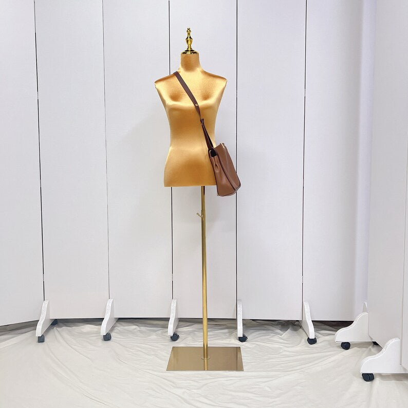 🔥1).Introducing our premium female half body mannequin, crafted with satin fabric and set on an elegant gold square base. Available in versatile colors like white, black, grey, and rose gold, this mannequin is perfect for showcasing apparel in boutique clothing stores and window displays. The soft satin covering not only enhances the mannequin’s appearance but also provides a delicate backdrop that allows garments to shine. The sturdy gold base ensures stability, offering both practicality and a modern, high-end look. Elevate your boutique's visual merchandising with this exquisite mannequin, designed to bring a touch of luxury to your store displays.