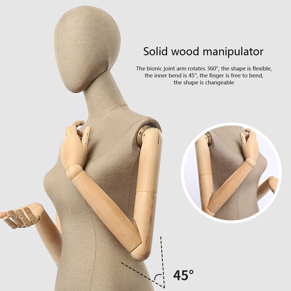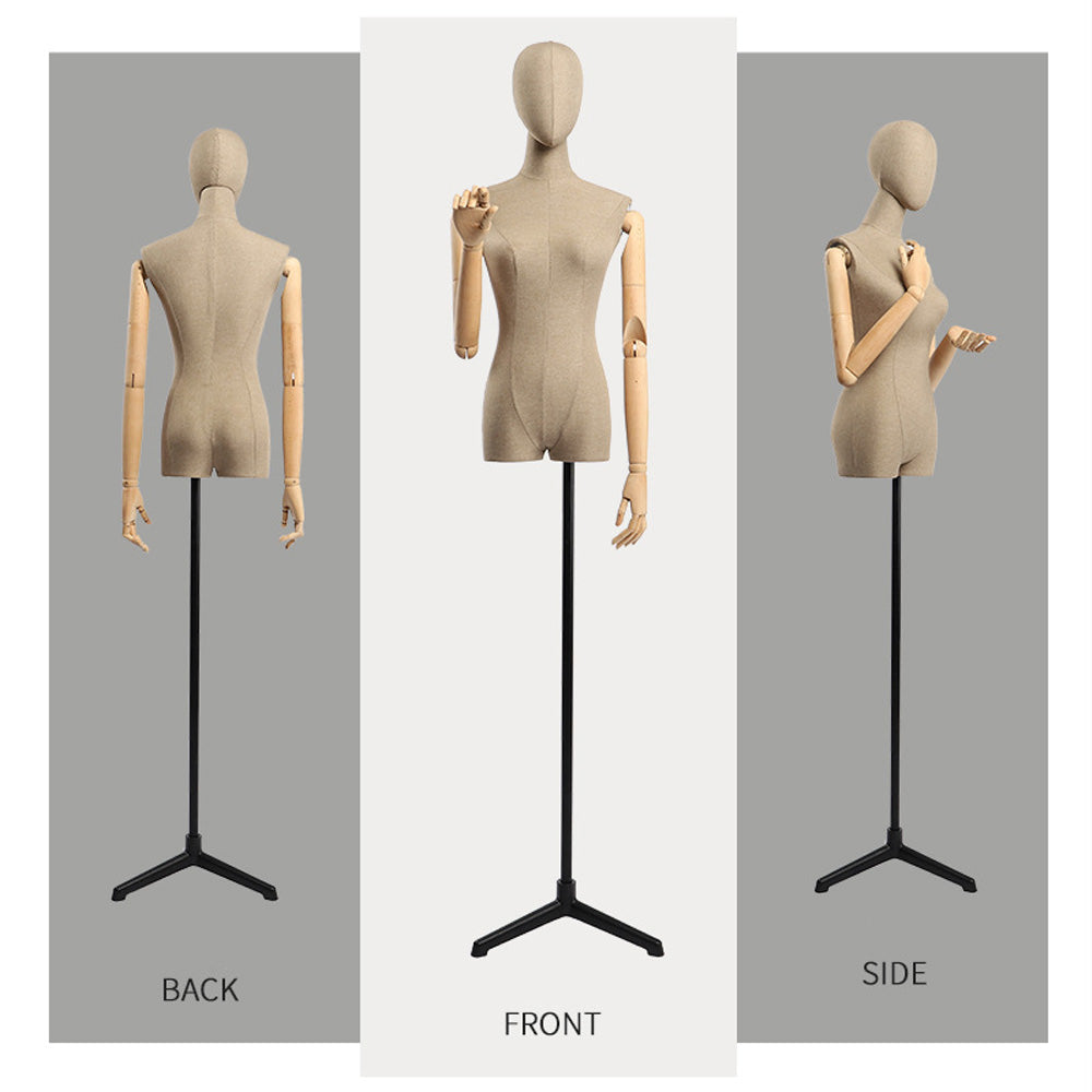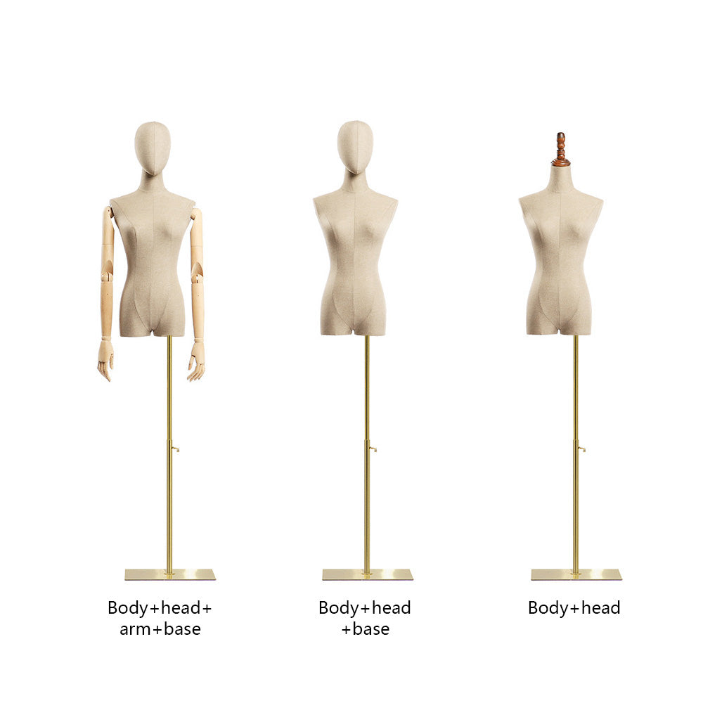 The product is clothing boutique store high quality female linen mannequin torso dress form,have with detachable mannequin head or with wooden head cap for u chioce,also with detachable wooden arms or without detachable wooden arms for u chioce,have different options to meet different customer's requirement,the design are very creative and fashion,use it to dress up your store can grab customer's attention,use it to dress up your window can make your window become more shiny and gorgeous,use it to dress up your works can present perfect display effect, also can use it to display your products in a window, on a counter, on the trade show, or on the floor,Ideal for sweaters, T-shirts, jackets, dresses, gowns,blouses,suits,coats,pants,trousers,clothing accessories,tops and bottoms.