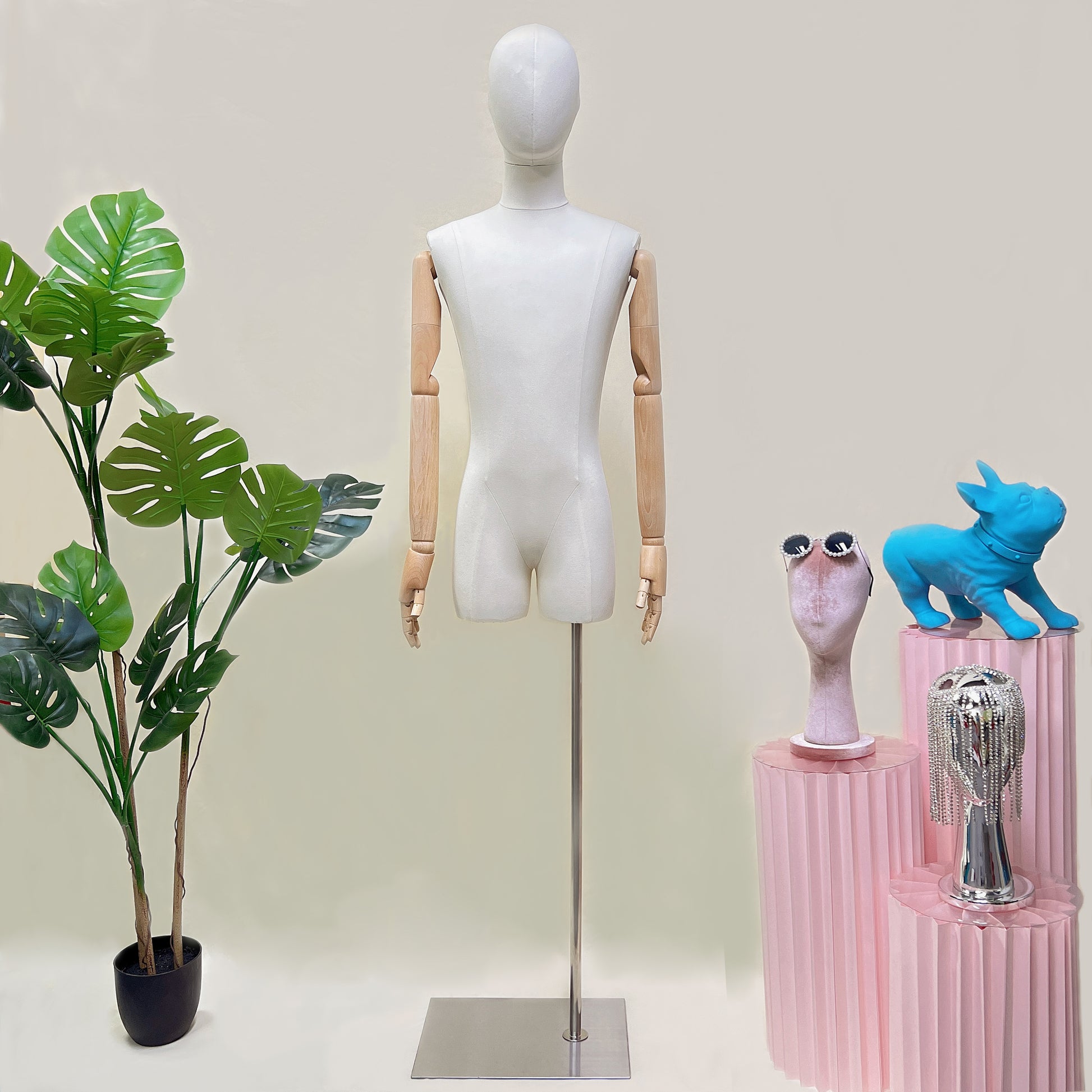 The product is Newly Updated Fashion Quality High End Half Body Male Mannequin Torso,match detachable wooden mannequin arms and detachable fabric head,have grey and beige two mannequin color for u choose, the design are very beautiful and fashion, use it to dress up your store can grab customer's attention,use it to dress up your window can make your window become more shiny and gorgeous,use it to dress up your works can present perfect display effect, will make a superb addition to your life !