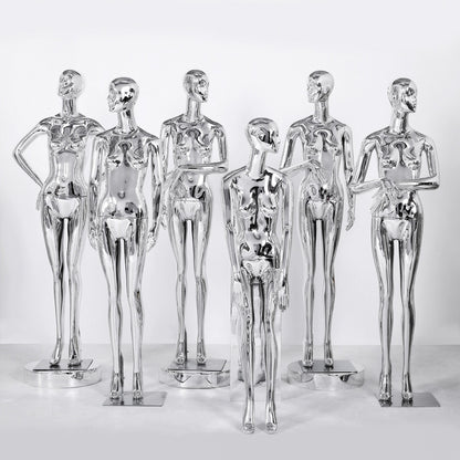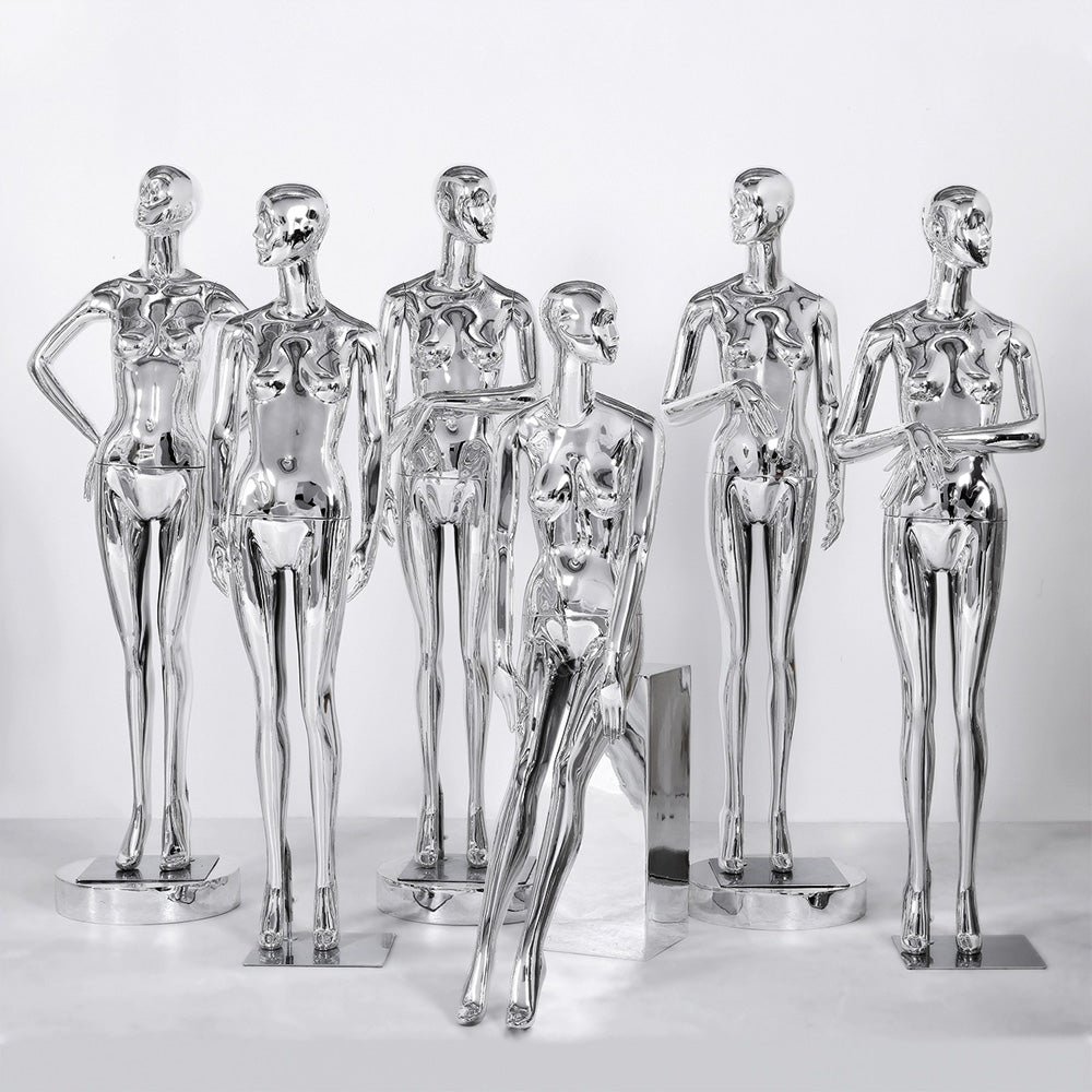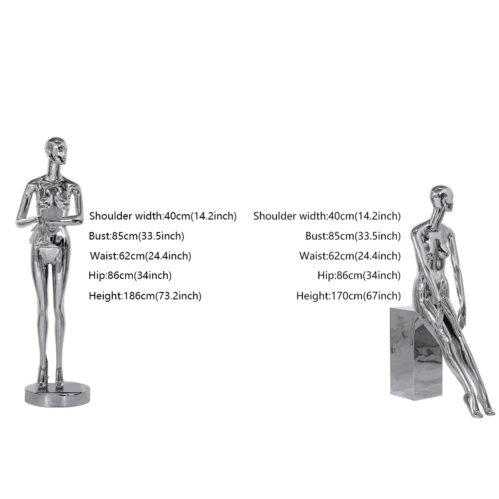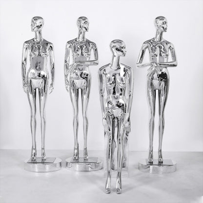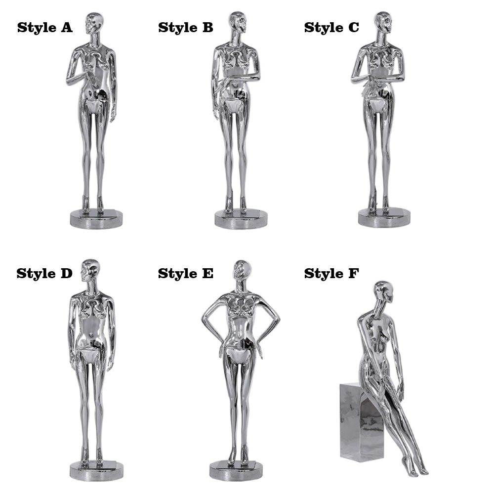 The product is Luxury clothing store standing sitting pose shiny chrome female full body mannequin,plated glossy silver women mannequin body,have standard mannequin shape, very high end,gorgeous and elegant, the design also are very modern and creative,can display the beautiful of clothing use different model pose, have 5 female standing pose for you choice and 1 female sitting pose for you choice, use it to dress up your store can grab customer's attention,use it to dress up your window can make your window become more attractive and gorgeous,use it to dress up your works can present perfect display effect, also can use it to display your products in a window, on a counter, on a display shelf,on the trade show or on the floor,Ideal for sweaters, T-shirts, jackets, dresses, coat,blouses, pants,trousers,clothing accessories,tops and bottoms.