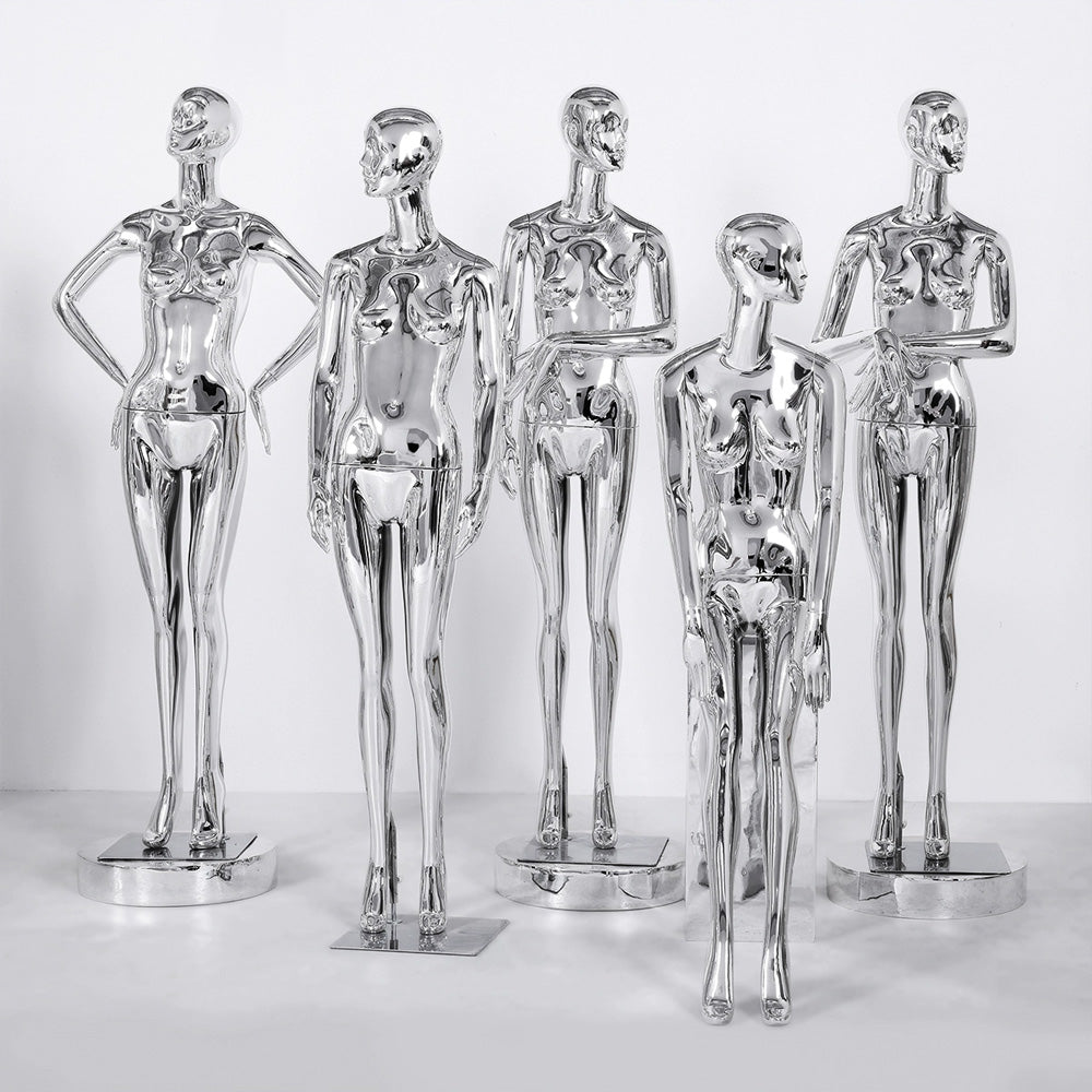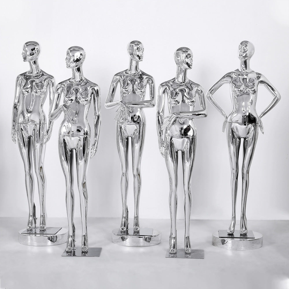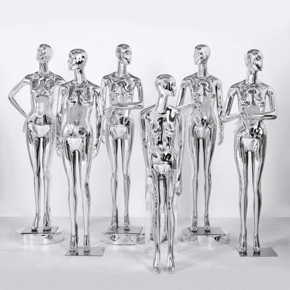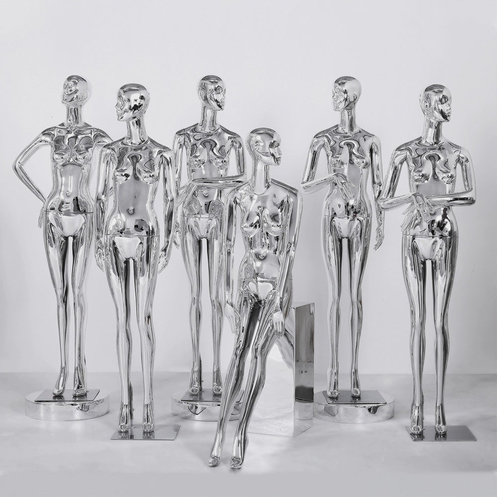The product is Luxury clothing store standing sitting pose shiny chrome female full body mannequin,plated glossy silver women mannequin body,have standard mannequin shape, very high end,gorgeous and elegant, the design also are very modern and creative,can display the beautiful of clothing use different model pose, have 5 female standing pose for you choice and 1 female sitting pose for you choice, use it to dress up your store can grab customer's attention,use it to dress up your window can make your window become more attractive and gorgeous,use it to dress up your works can present perfect display effect, also can use it to display your products in a window, on a counter, on a display shelf,on the trade show or on the floor,Ideal for sweaters, T-shirts, jackets, dresses, coat,blouses, pants,trousers,clothing accessories,tops and bottoms.
