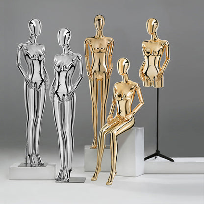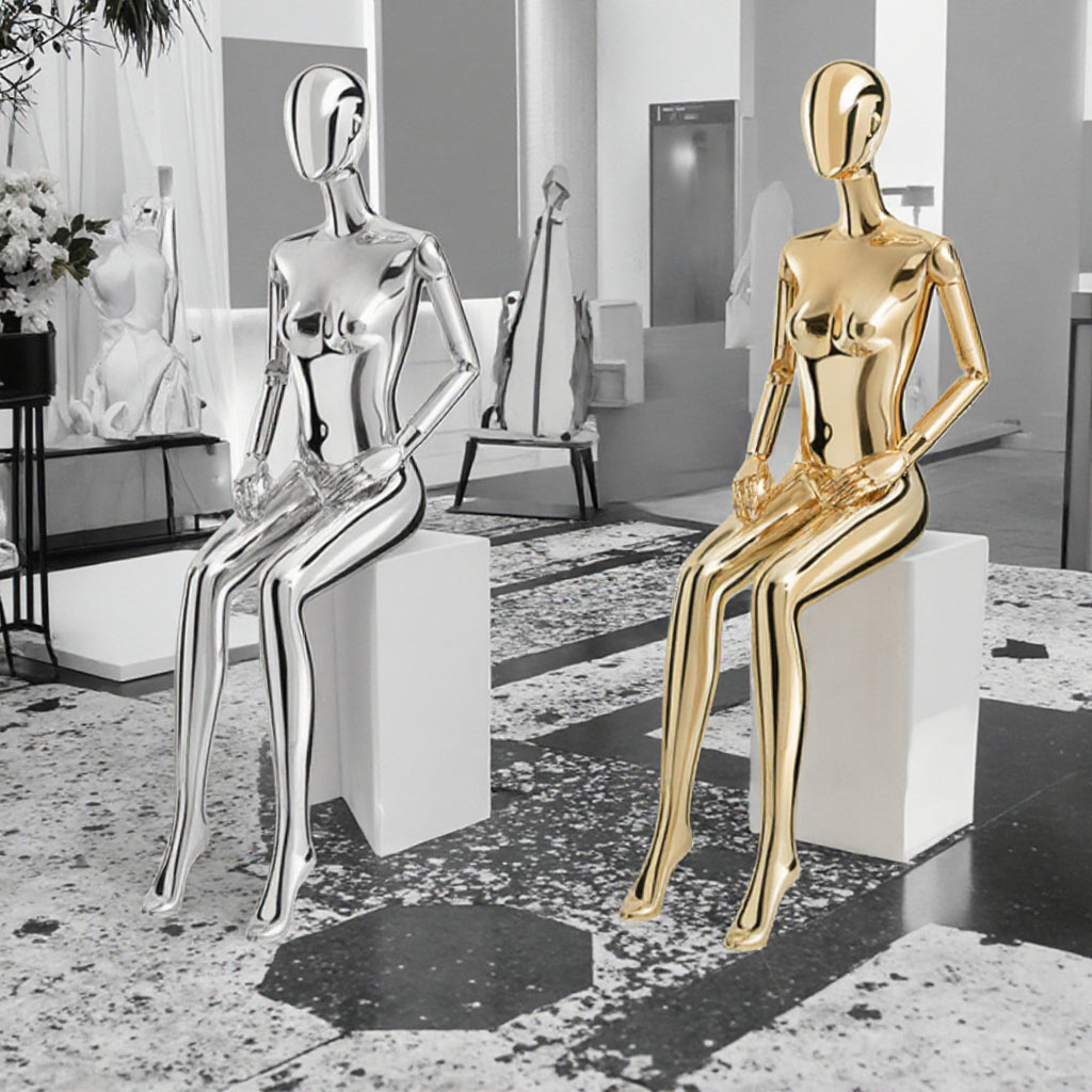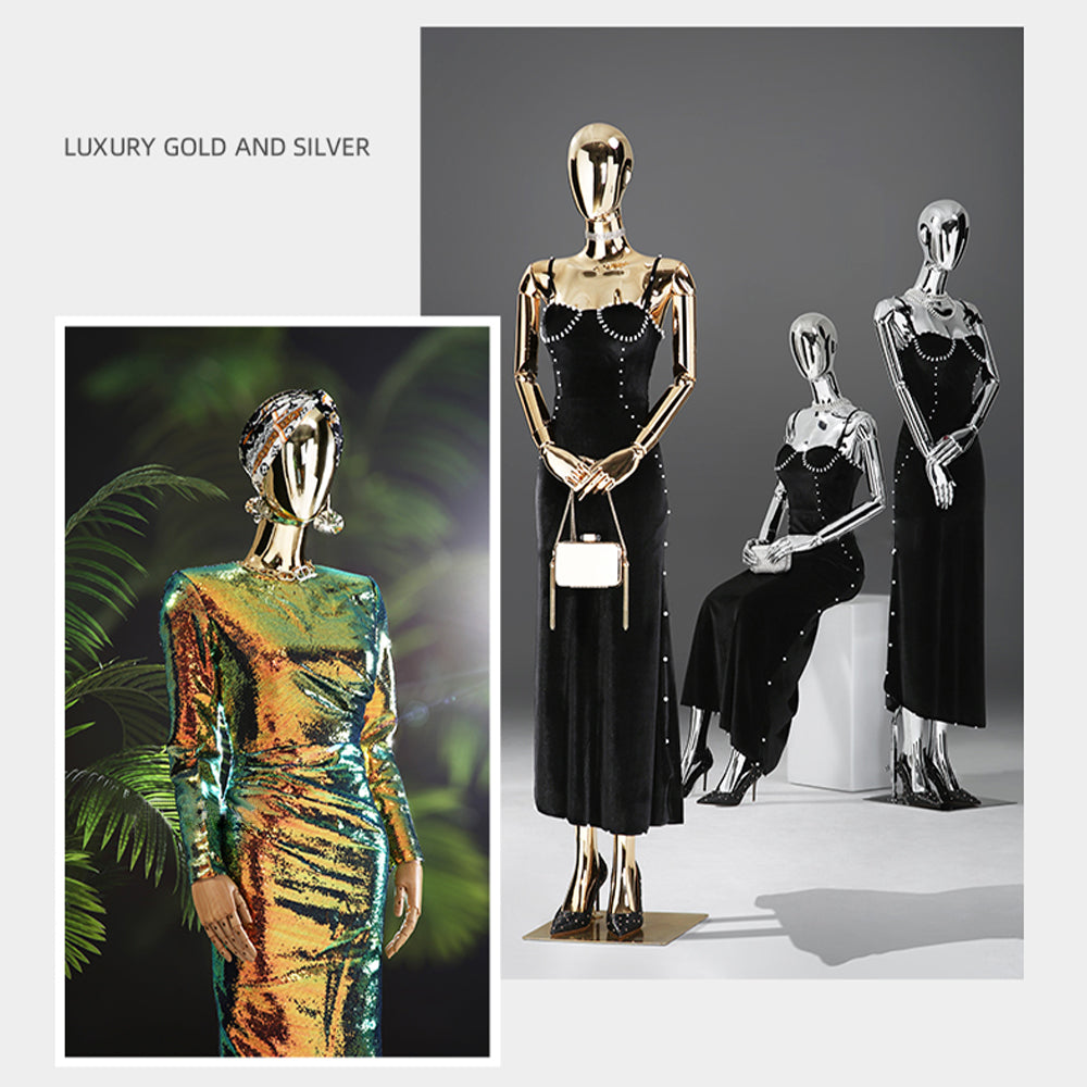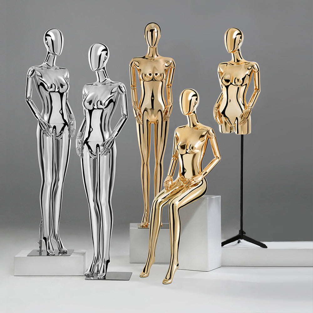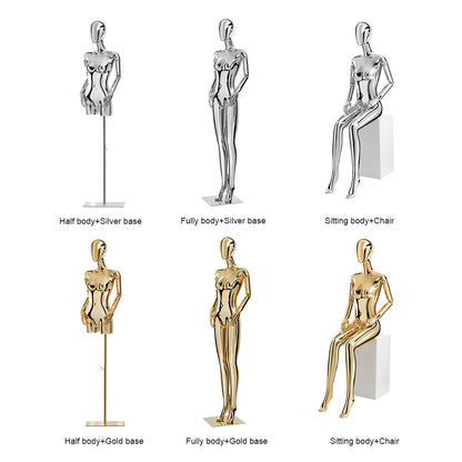 Upgrade your boutique store's visual appeal with luxury female electroplated mannequins. Available in standing posefull body,sitting pose full body and half body styles, with gold and silver finishes, these mannequins boast a refined, smooth surface and a comfortable touch. Ideal for displaying clothing and clothing accessories like sunglasses, hat,scarves, jewelry and more, come with three different base options—gold square base, silver square base and white stool. Perfect for in-store displays, window presentations, and home decor, can bring sophistication and help highlight your products, improving the overall ambiance.