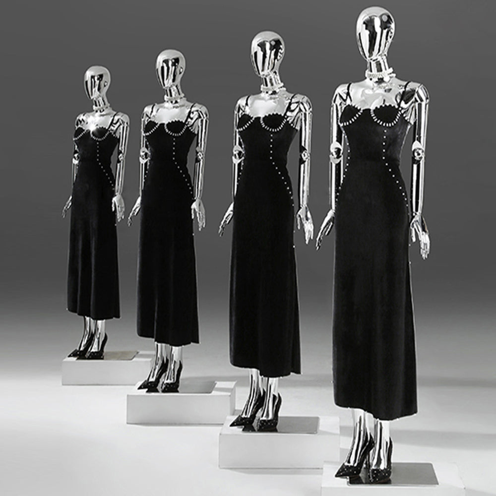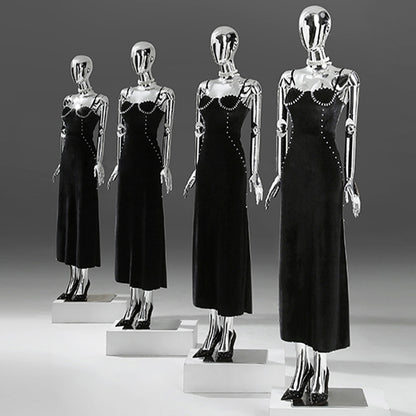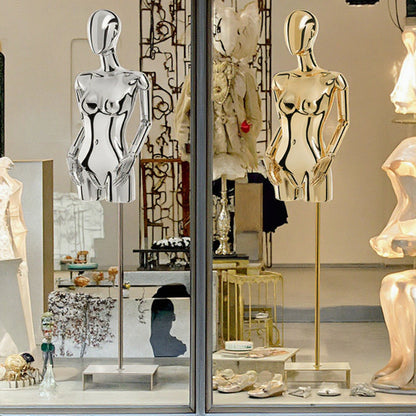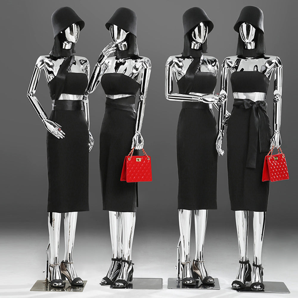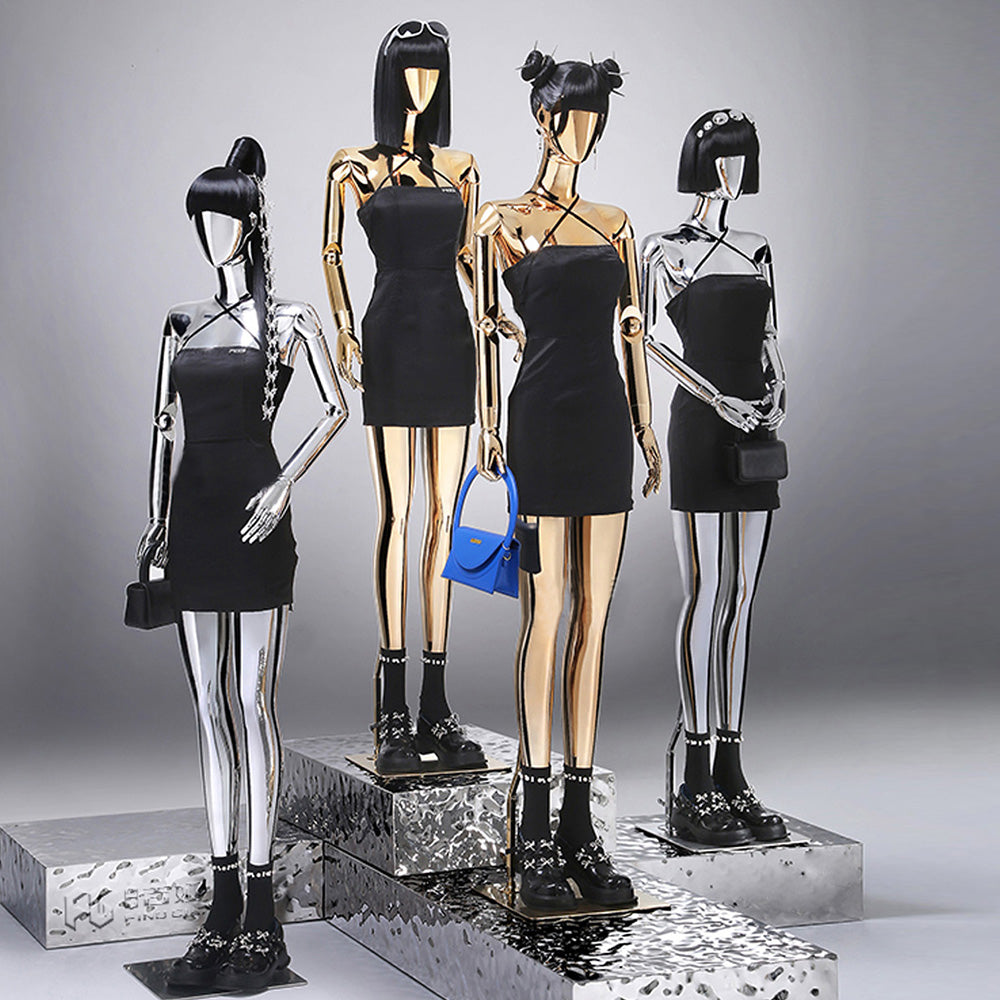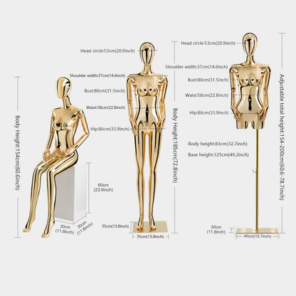 Upgrade your boutique store's visual appeal with luxury female electroplated mannequins. Available in standing posefull body,sitting pose full body and half body styles, with gold and silver finishes, these mannequins boast a refined, smooth surface and a comfortable touch. Ideal for displaying clothing and clothing accessories like sunglasses, hat,scarves, jewelry and more, come with three different base options—gold square base, silver square base and white stool. Perfect for in-store displays, window presentations, and home decor, can bring sophistication and help highlight your products, improving the overall ambiance.
