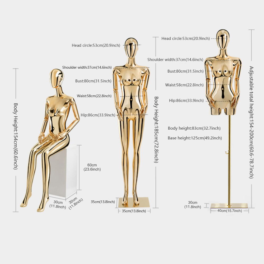 👍1).Luxury female electroplated mannequins are designed to enhance your store displays. Available in standing posefull body,sitting pose full body and half body styles, with both gold and silver finishes to match your aesthetic. Crafted with premium plastic for a smooth, comfortable feel, they feature gold or silver square bases and a white stool. Perfect for showcasing clothing and accessories like sunglasses, scarves, hat and jewelry and more, these mannequins are ideal for boutique store displays, window showcases, and home decor. Their elegant design helps accentuate your products while boosting your boutique’s overall ambiance.