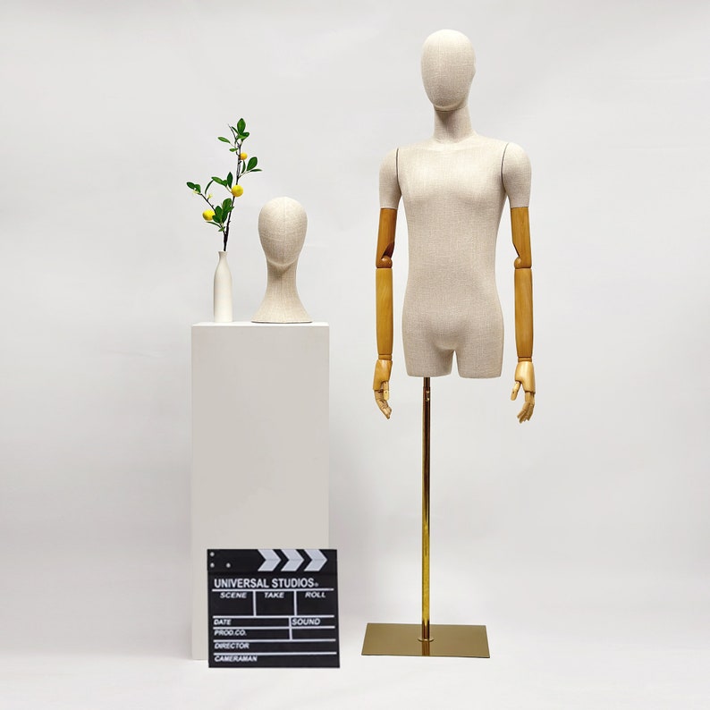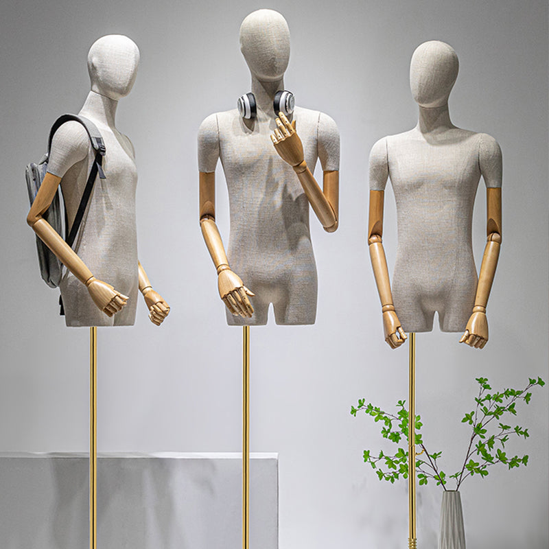 Showcase your products in style with these high quality male and female half body mannequins, expertly crafted with premium fiberglass for durability and wrapped in elegant bamboo linen fabric. Designed for boutiques, window displays, and home décor, they offer a refined, upscale appearance that highlights clothing and accessories beautifully. Available with a gold square or gold round base, these mannequins provide stability while enhancing the aesthetic appeal. The flexible arrangement options allow for endless creative combinations, making them ideal for showcasing apparel, jewelry, hats, scarves, sunglasses, and headphones. Whether for in-store merchandising, window displays, or home décor, these mannequins enhance product presentation and elevate brand image. Their sleek and artistic presence enhances store ambiance and creates a striking focal point that elevates product presentation. With exquisite craftsmanship and modern elegance, they are an essential addition to any fashion-forward display.