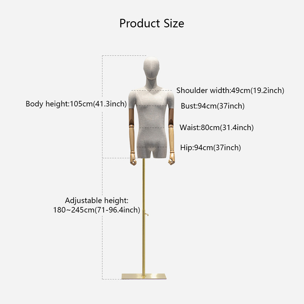 Jelimate High Grade Male Mannequin Torso,Grey Linen Mannequin Torso With Wooden Arms,Male Half Body Dress Form Mannequin,Clothing Store Clothing Display Model,Suit Display Male Half Body Model