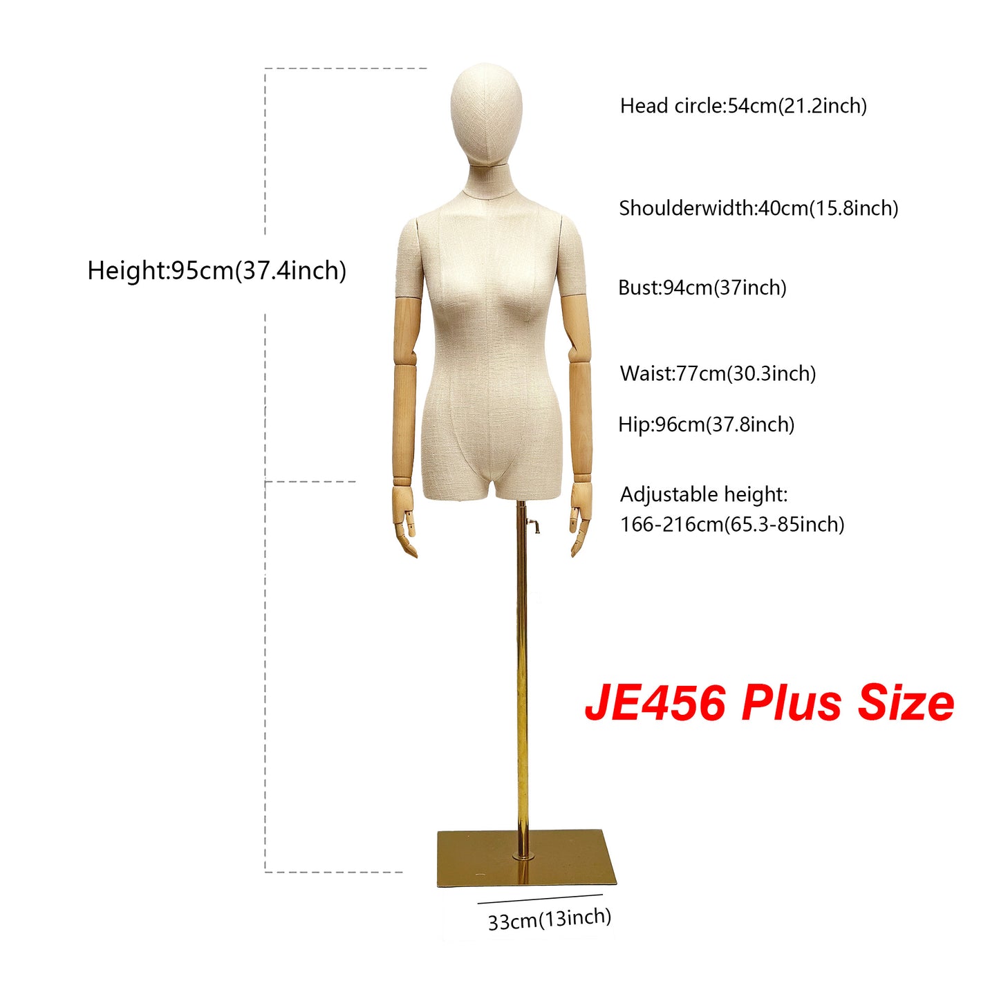 💖JE456 Plus Size : Head Circle: 54 cm(21.2 inch),Shoulder Width:40 cm(15.8 inch),Bust: 94 cm(37inch),Waist:77 cm(30.3 inch),Hip:96 cm(37.8 inch),Body Height:95 cm(37.4 inch),Adjustable Total Height: 166-216 cm (65.3-85 inch),Base Length :40cm (15.7 inch),Base Width :30cm (11.8 inch).