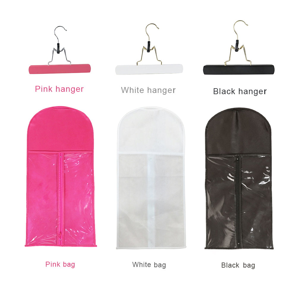 💥8). Transparent Clear Zipper Non Woven Wig Storage Packaging Bag with Hair Hanger Extension Storage Bags Hair Extension Packaging Bag Wig Bags with Hanger Hair Bags Hair Extensions Packing Bag With Hanger Human Hair Extensions HangerLow MOQ High Quality Custom Label Dustproof Zip Lock Black Pink White Bag With Hanger Hair Wig Storage Bags