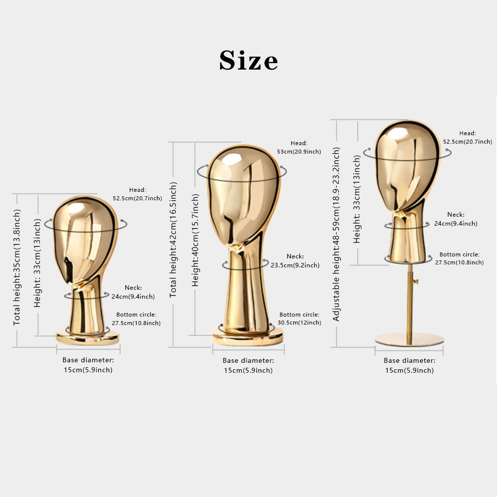 Cabeza plateada de cuello largo de 40 cm: Altura: 40 cm (15,7 pulgadas), Altura total: 42 cm (16,5 pulgadas), Círculo de la cabeza: 53 cm (20,9 pulgadas), Círculo del cuello: 23,5 cm (9,2 pulgadas), Círculo inferior: 20,5 cm (12 pulgadas), Diámetro de la base: 15 cm (5,9 pulgadas)