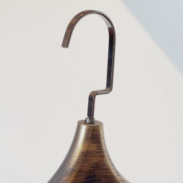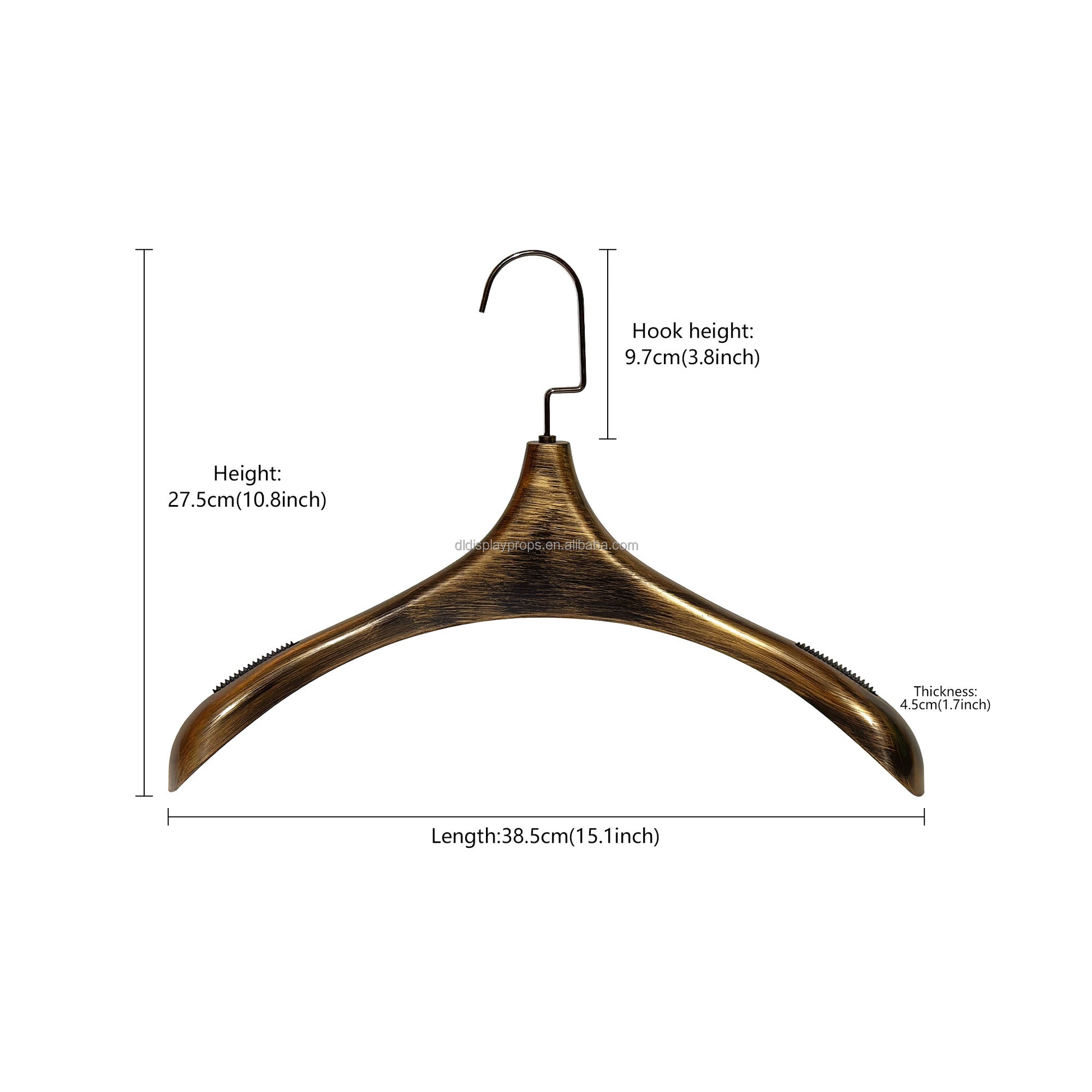Percha vintage de metal cepillado a mano, color negro y dorado. Acabado texturizado con logotipo personalizado para trajes y abrigos.