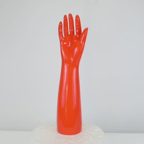This glossy orange right hand full arm mannequin features a vibrant high-gloss finish that is perfect for displaying gloves, headphones, and sports accessories. Ideal for boutiques, sports stores, electronics shops, trade shows, and photographic styling, it’s a must-have prop for creating eye-catching product presentations.