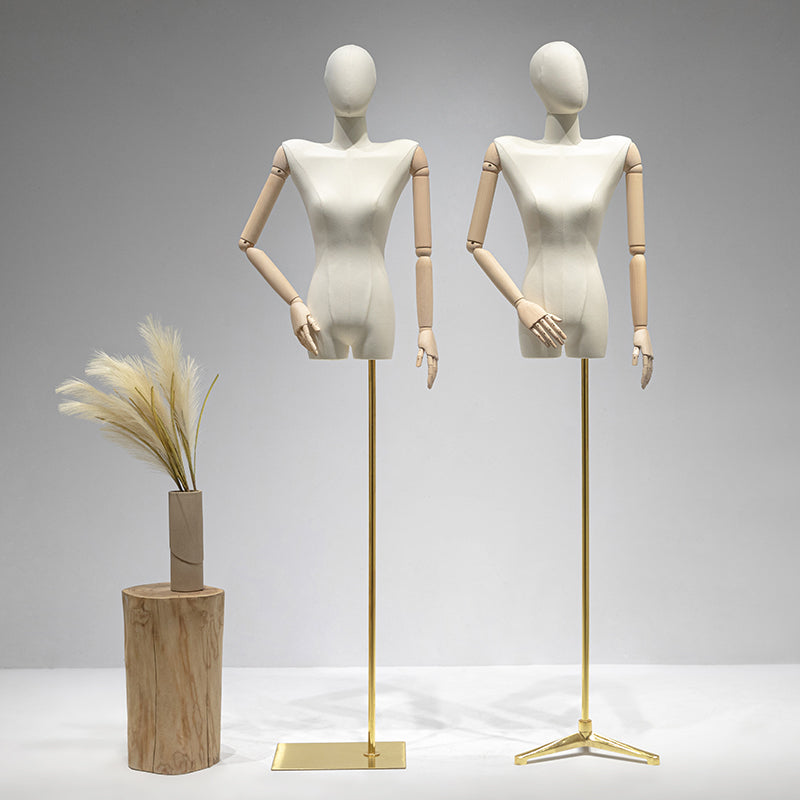 Este maniquí femenino de medio cuerpo con base de metal es nuestro nuevo producto muy de moda, tela de terciopelo de piel de almizcle, atmósfera de alta calidad.