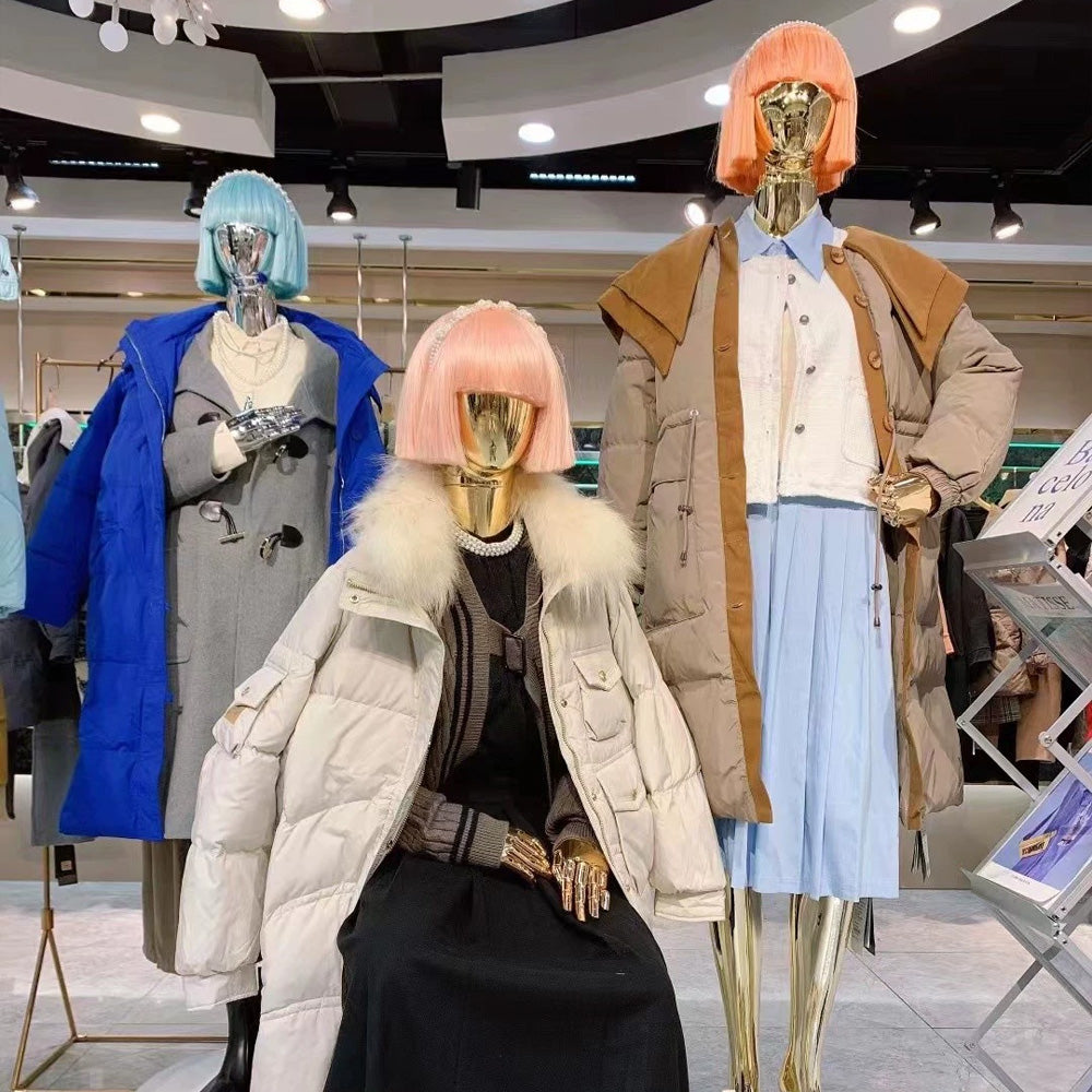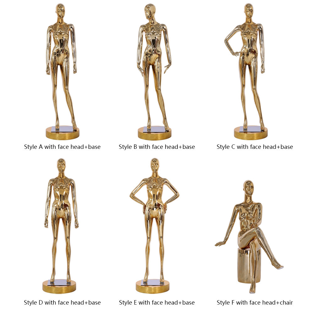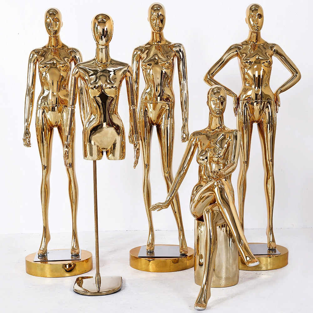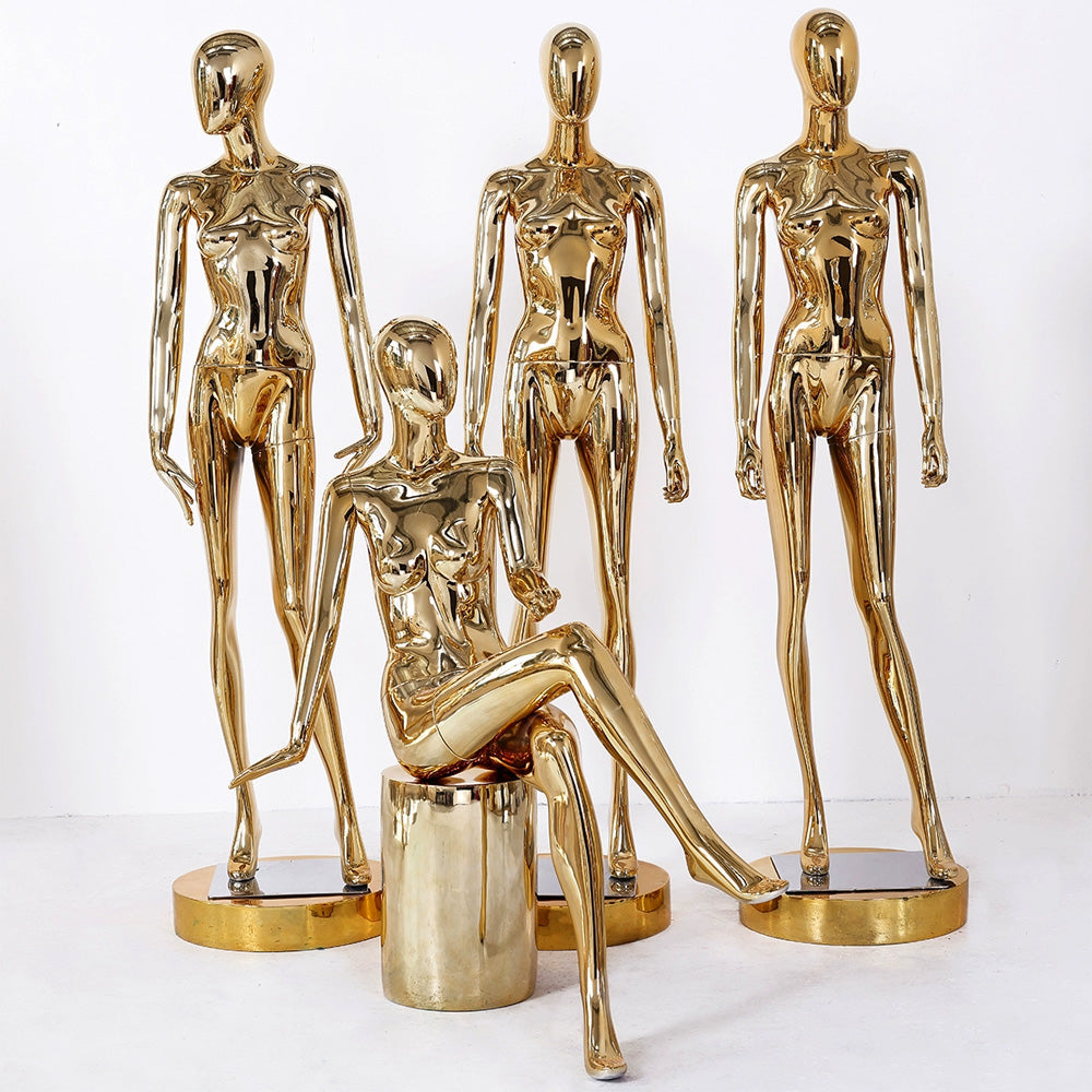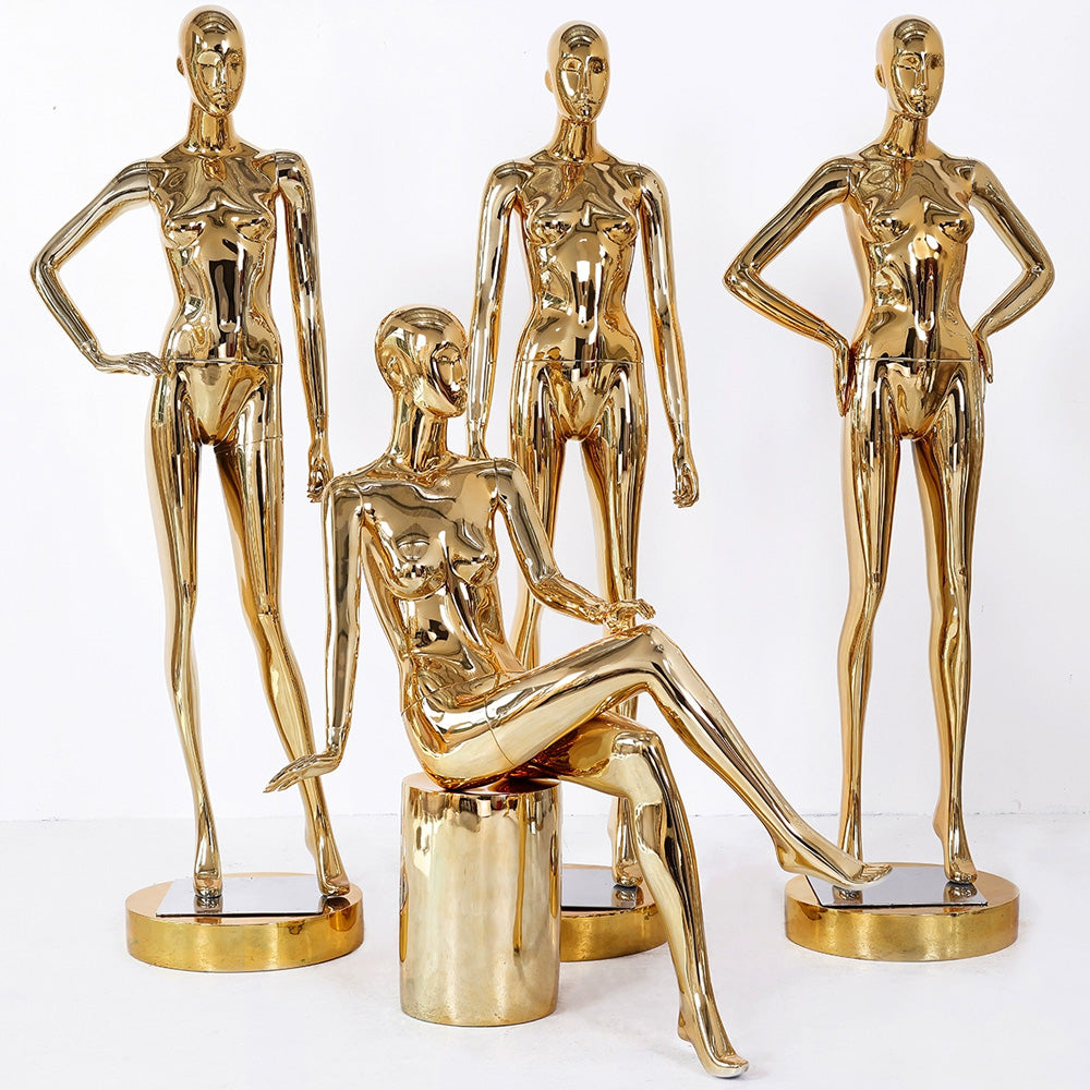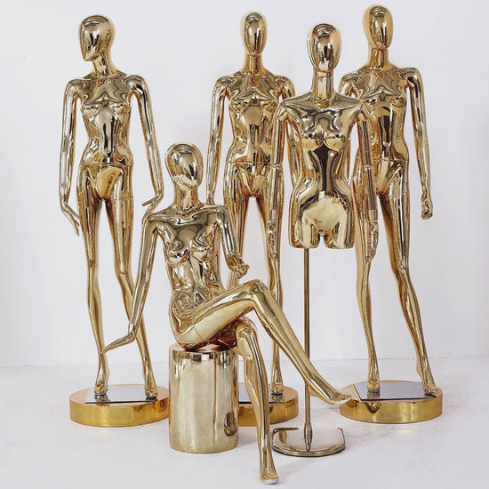Elevate your boutique or showroom with our stunning gold plated female mannequin. Featuring a high-end fiberglass construction with glossy electroplated finish, this full-body display mannequin brings luxury and sophistication to any retail space.
