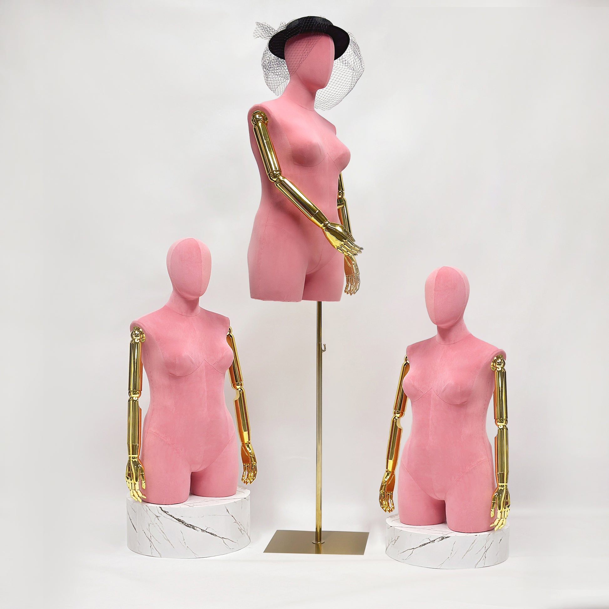 🔥1).Exquisite Suede Finish: Wrapped in luxurious pink suede fabric, this mannequin offers a soft, suede fabric texture that adds a touch of elegance and sophistication to your display. The high quality material not only enhances the visual appeal but also provides a durable surface that maintains its premium look over time.The golden hands can detachable, the head can detachable.
