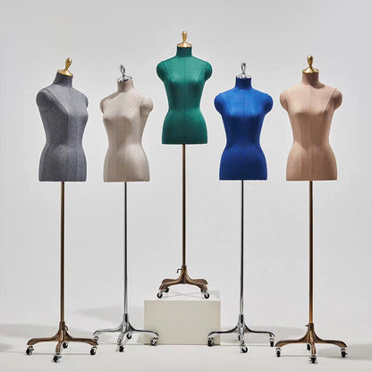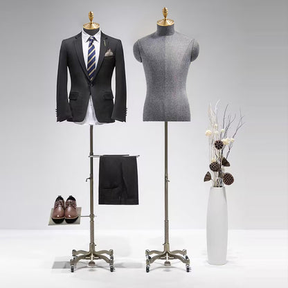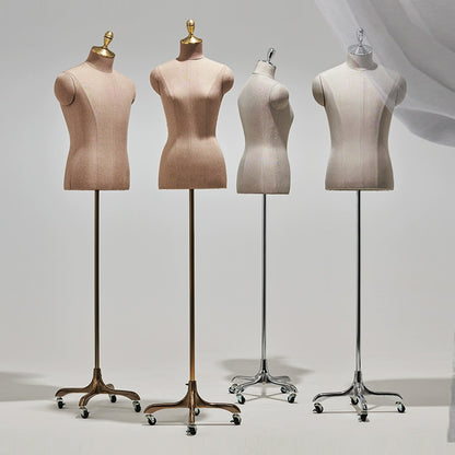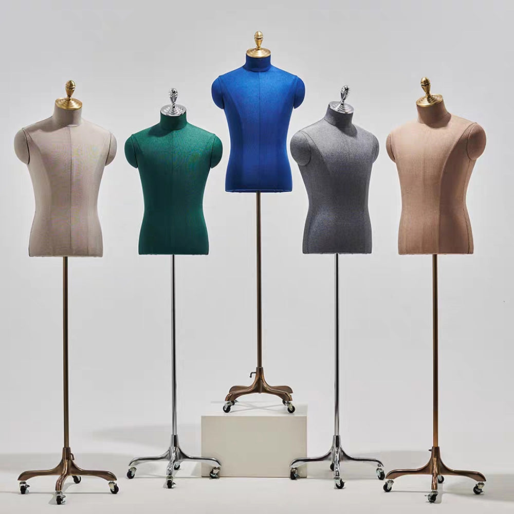 Enhance your boutique’s visual appeal with the JELIMATE high end half body linen covered mannequin, available in both male and female options. Each mannequin is meticulously wrapped in premium linen fabric for a textured, natural look that complements any store aesthetic. Supported by a sleek gold wheeled base , this mannequin is both stylish and functional, easily moved to refresh displays throughout your store. Ideal for showcasing apparel, accessories, or complete outfits, this display mannequin creates eye-catching arrangements that draw attention to your featured items. Perfect for in-store displays and captivating window presentations, JELIMATE male female half body mannequins add sophistication to every corner of your boutique.It also can use it to display your products in a window, on a counter, on a display shelf, on the exhibition ,on the exhibition trade fair or on the floor, Ideal for sweaters, T-shirts, jackets, suits, blouses,pants,trousers,clothing accessories, tops and bottoms .