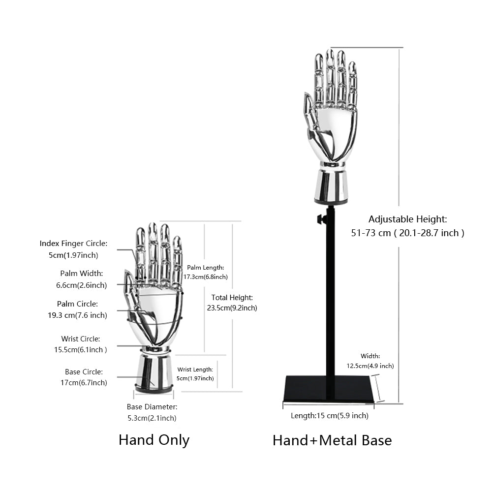 💟Hand Size: Index Finger Circle : 5 cm( 1.97 inch ), Palm Circle : 19.3 cm ( 7.6 inch ) ,Wrist Circle : 15.5 cm ( 6.1 inch ), Palm Length : 17.3 cm (6.8 inch),Wrist Length : 5 cm (1.97 inch) , Total Height : 23.5 cm ( 9.2 inch ),Base Diameter : 5.3 cm ( 2.1 inch ),Base Circle : 17 cm ( 6.7 inch ).