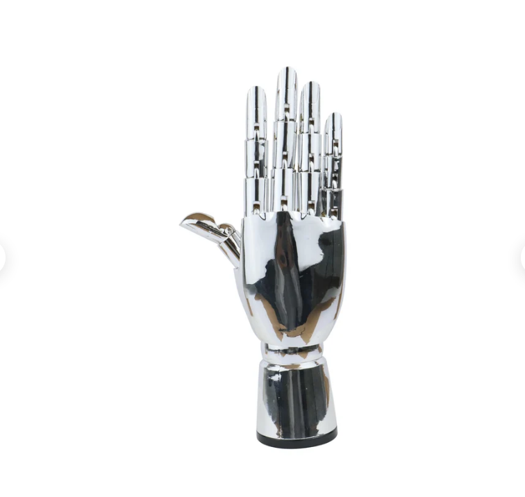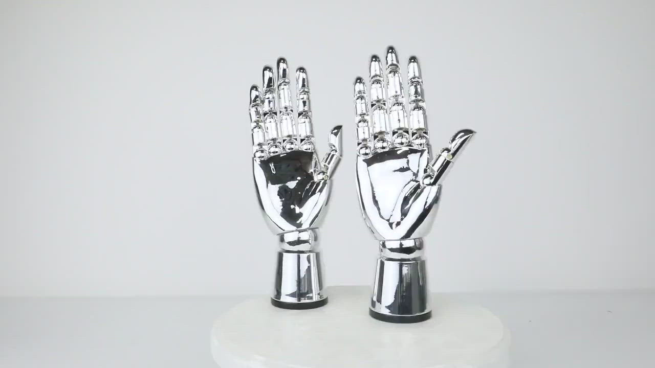 The product is luxury chrome plating hand,the design is very modern and simple,use it to dress up your store can grab customer's attention,use it to dress up your home can make your home become more cozy and gorgeous,use it to display your product or design can get better showing effect.This is plated silver hand with/without metal base, This item is great for holding or displaying rings, chains, watches and scarves, along with other jewelry and fashion accessories. Wonderful accent piece for any home decor or retail display!