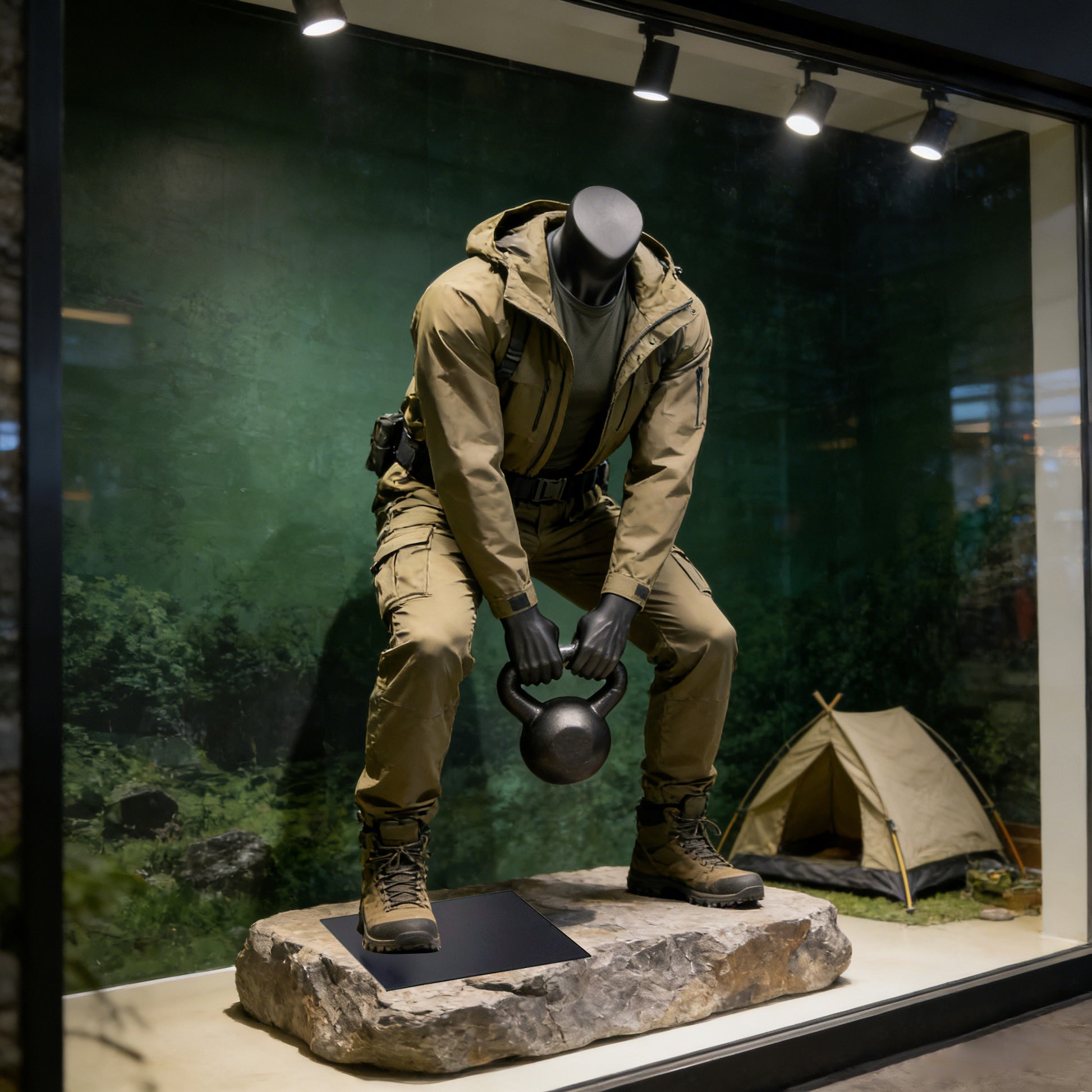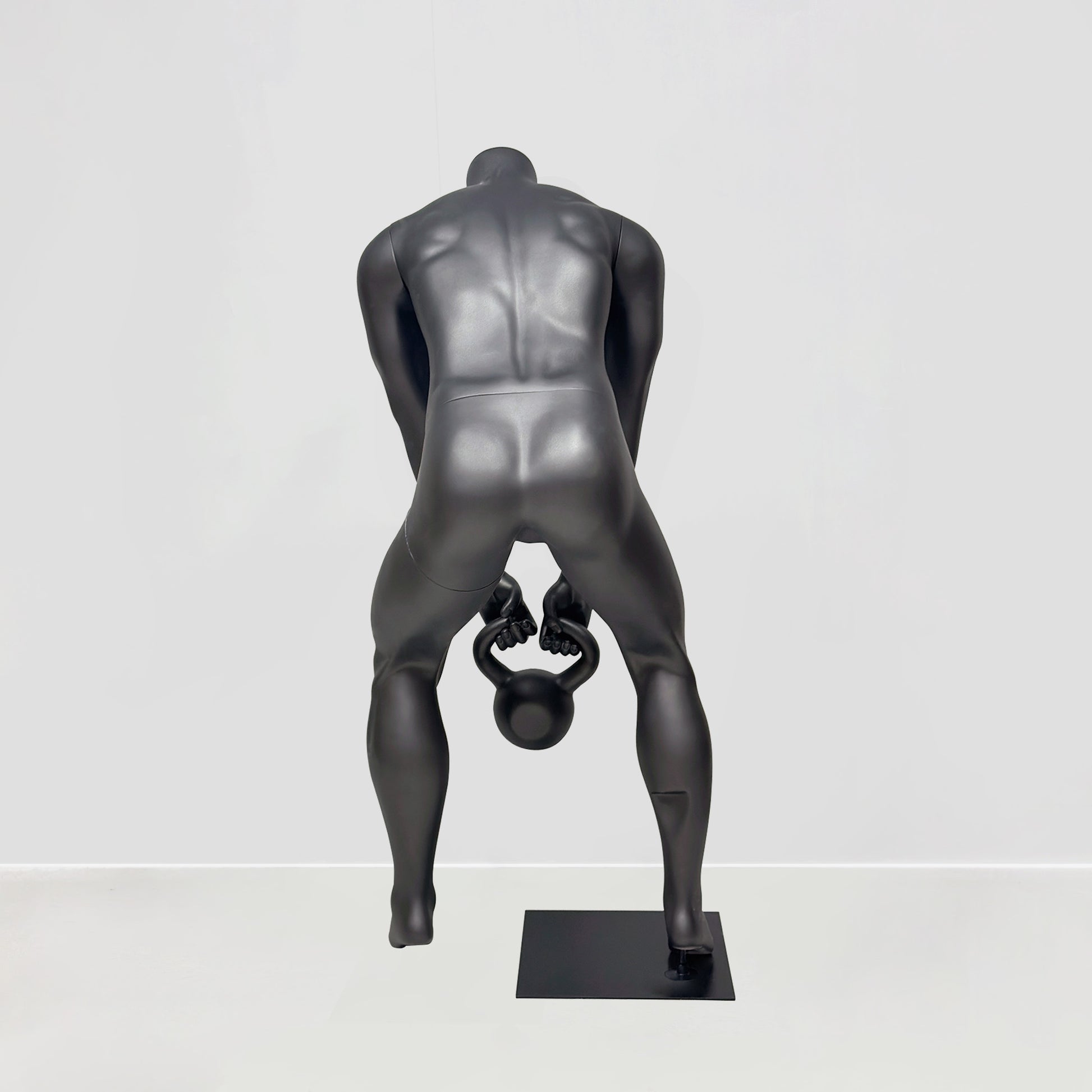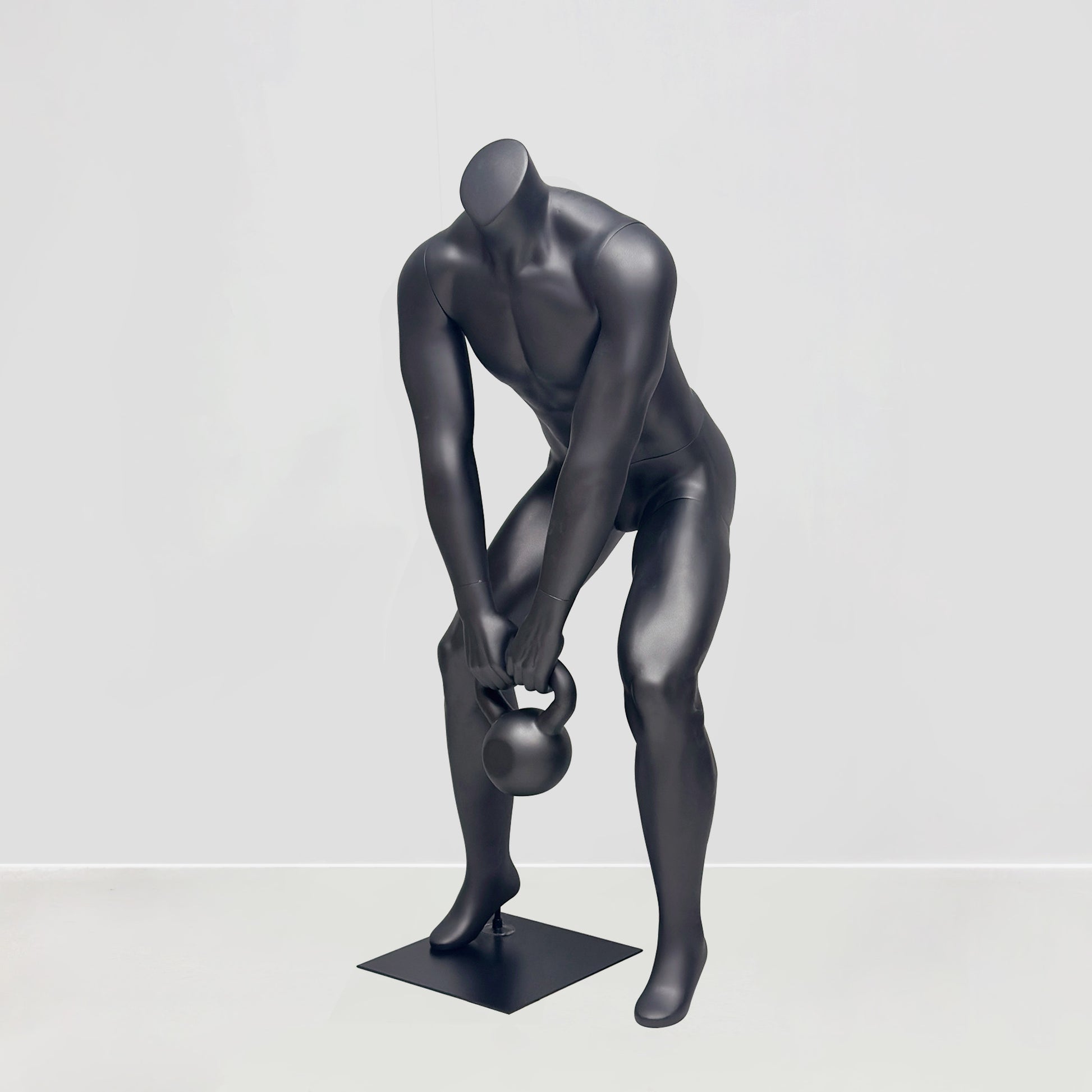 Premium headless male mannequin with kettlebell pose designed for athletic wear stores, fitness centers, and sports retail displays – this full-body fiberglass mannequin brings dynamic energy to your sportswear presentation with its realistic bent-over kettlebell lifting posture that showcases activewear, gym apparel, and athletic clothing in authentic workout positions.