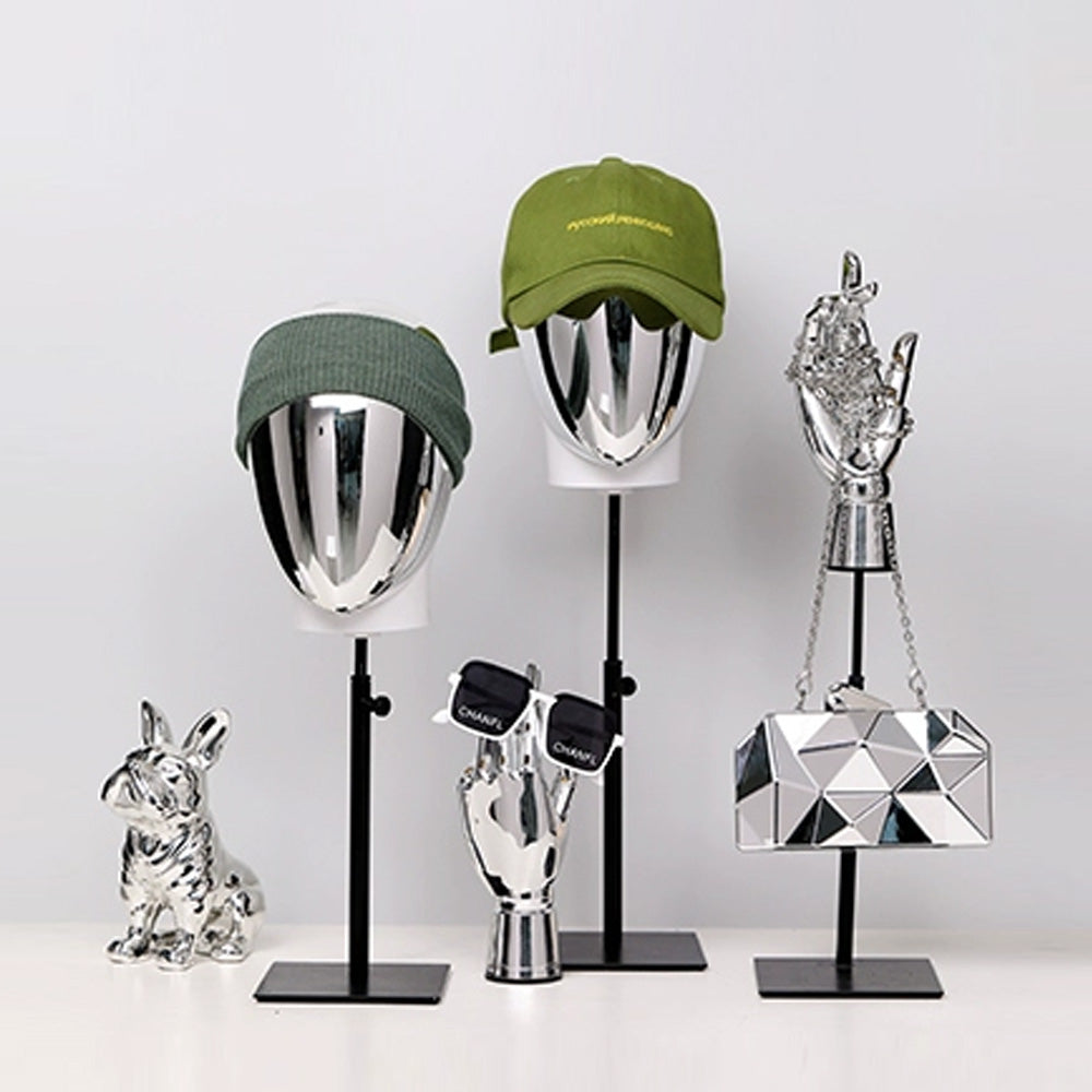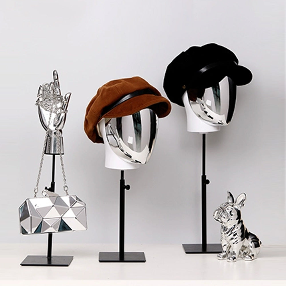 This is fashion boutique store high grade female male mannequin head stand,chrome and golden plate finished,Detachable half face, material is plastic, can avoid long way delivery, the plate face is fiberglass,with black square metal base,also have mannequin hand for u chioce,chrome and golden plate finished,flexible fingers,can freely to make different hand pose. It's very classical and new color for hat display stand, if you put your hat or your headpiece for decoration, it will be very beautiful.