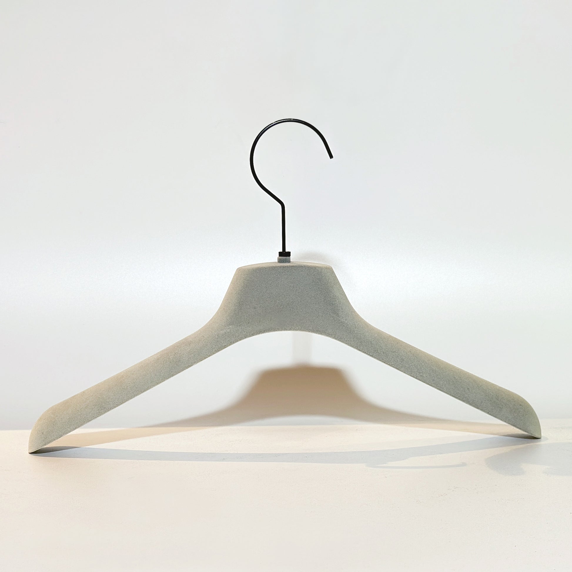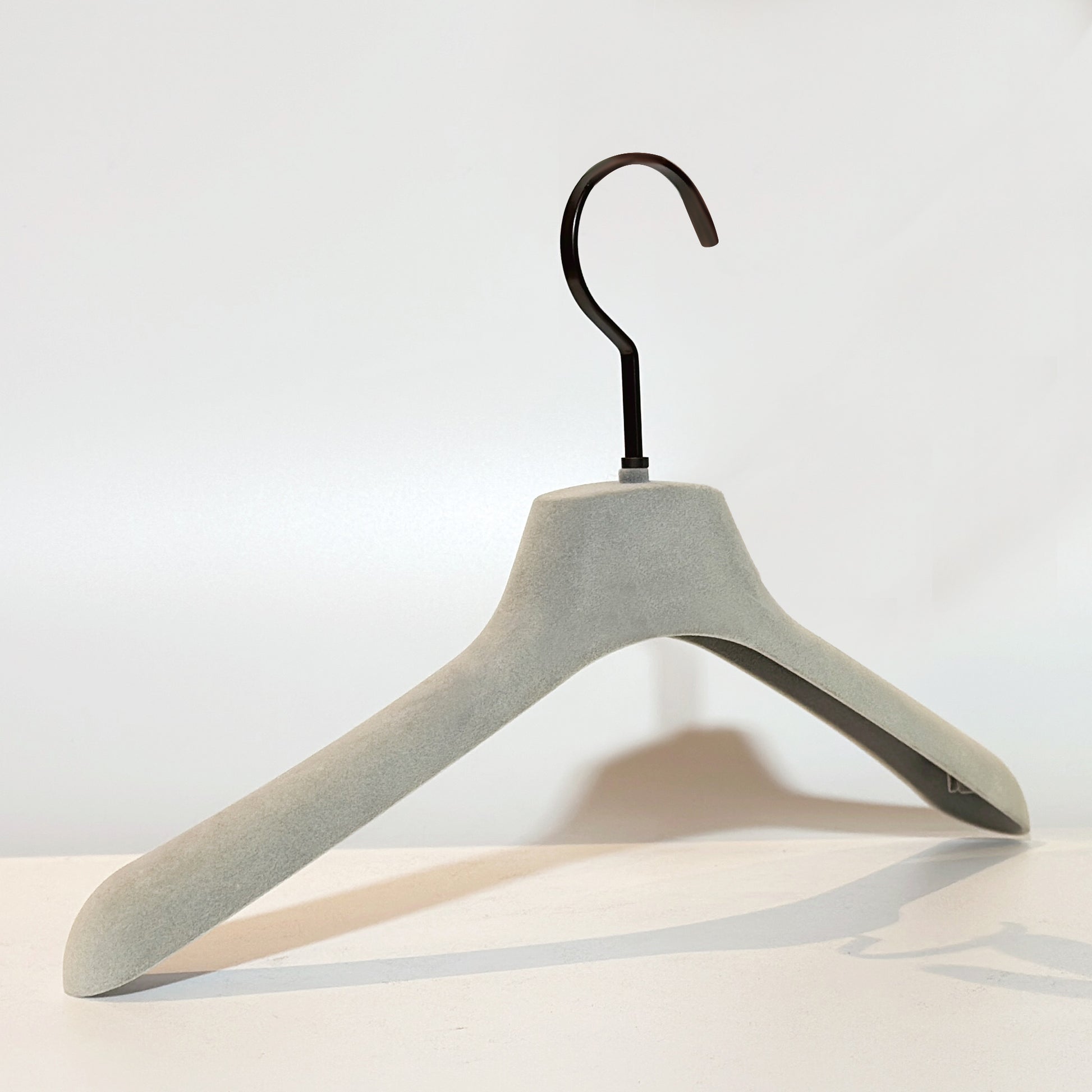 Grey Plastic Clothes Hanger with Velvet—a practical accessory for clothing storage and retail display. Ideal for hanging shirts, skirts, and pants, it features a non-slip velvet surface, ergonomic shoulders (to keep garment shape), and durable plastic build. Its sleek grey design fits modern aesthetics, suiting both daily use and professional merchandising.