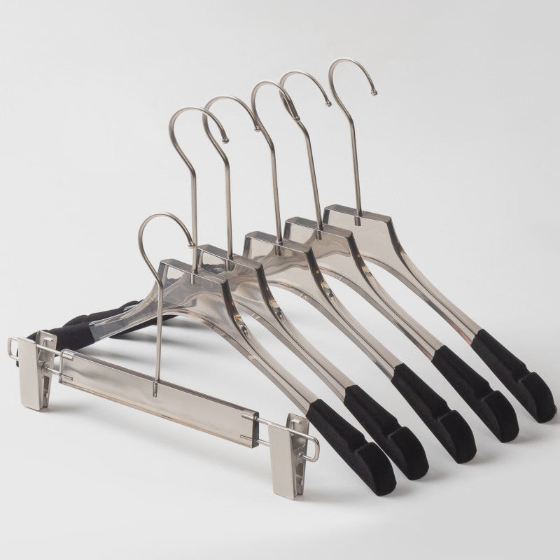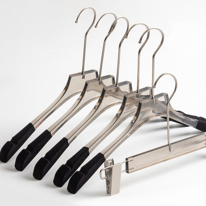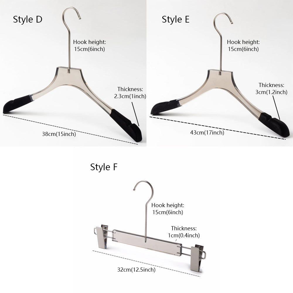 The product is Luxury Transparent Grey Acrylic Clothing Hanger Skirt Coat Trouser Pant Shirt Wedding Dress Clear Garment Hanger with Silver Hook , have top hanger and bottom hanger two style for u chioce,also have avant-garde unique accessories ring hanger to meet your different require,the design is very modern and simple,use it to dress up your store can grab customer's attention,use it to dress up your home can make your home become more cozy and gorgeous,use it to display your product or design can get better showing effect.