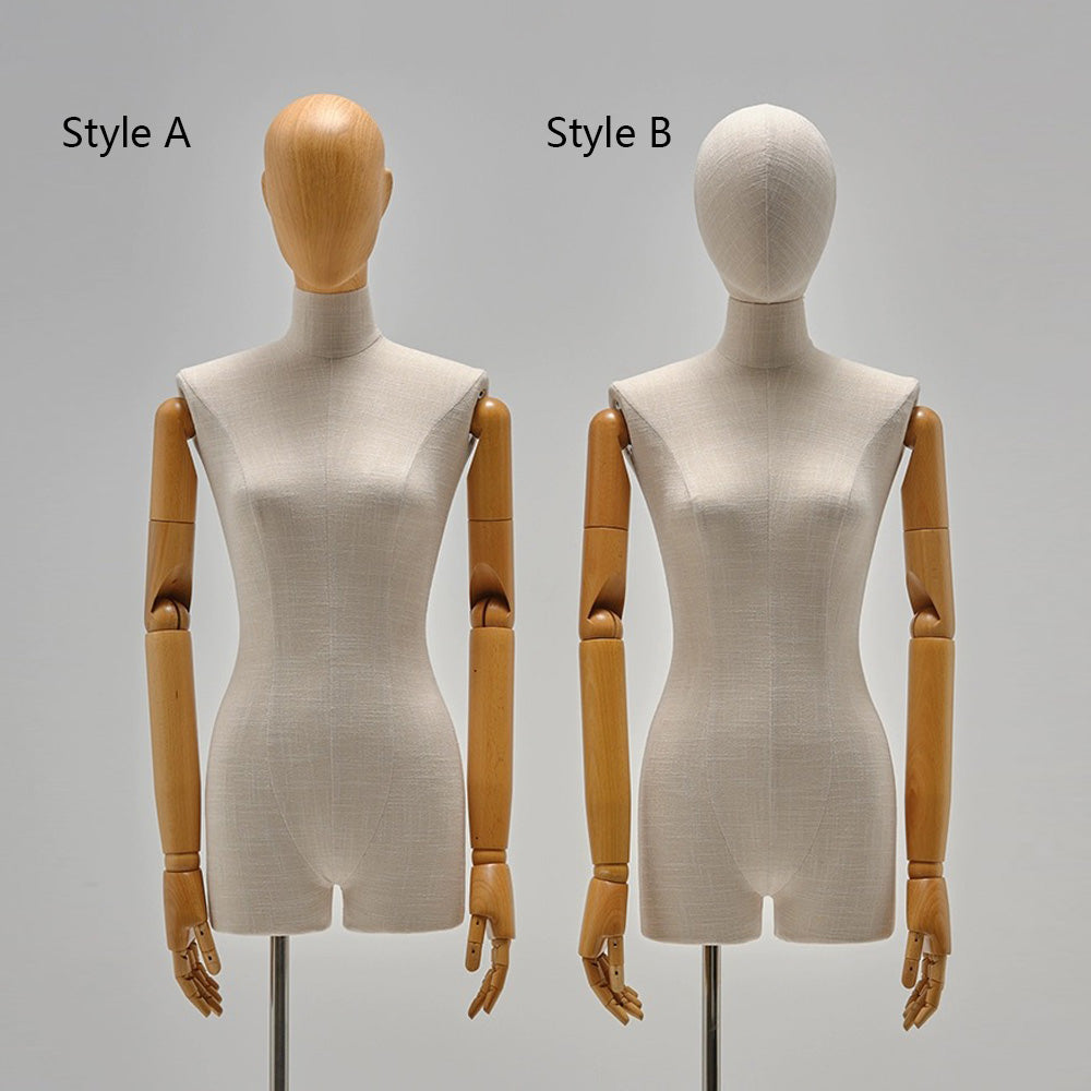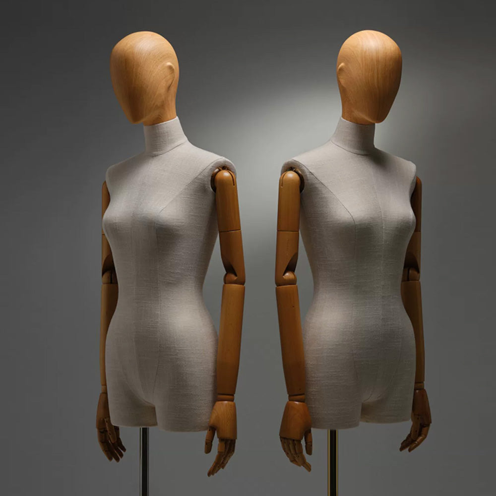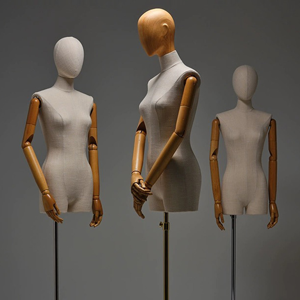 🔥1).Crafted for elegance and versatility, the JMFHB04 high end female half body mannequin is wrapped in premium bamboo linen fabric for a sophisticated, natural look. Featuring high quality wooden hands, a choice between a fabric covered or wooden head, and a sleek silver square base, this mannequin offers endless styling possibilities. Its durable fiberglass construction and refined craftsmanship make it perfect for showcasing clothing and accessories like jewelry, hats, scarves, sunglasses, and headphones. Whether enhancing boutique displays, window presentations, or home décor, the JMFHB04 mannequin brings luxury and refinement to any setting. Elevate your store’s visual appeal today!