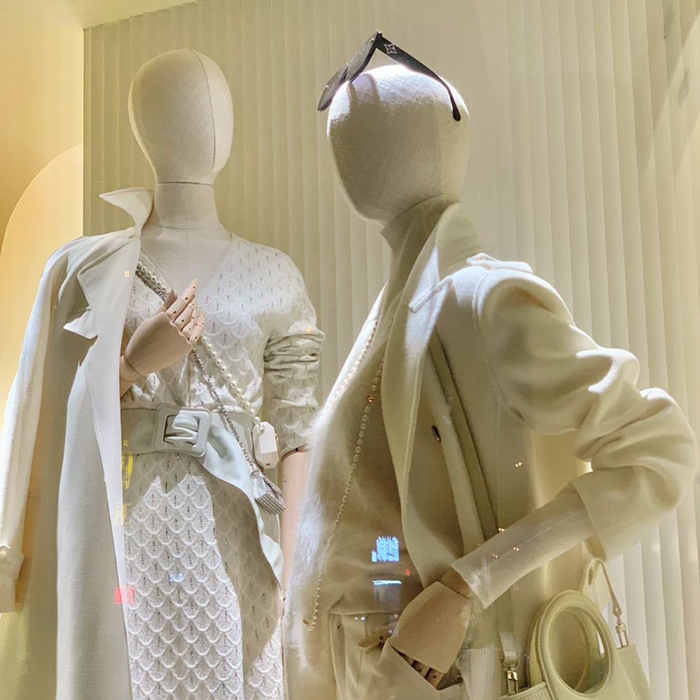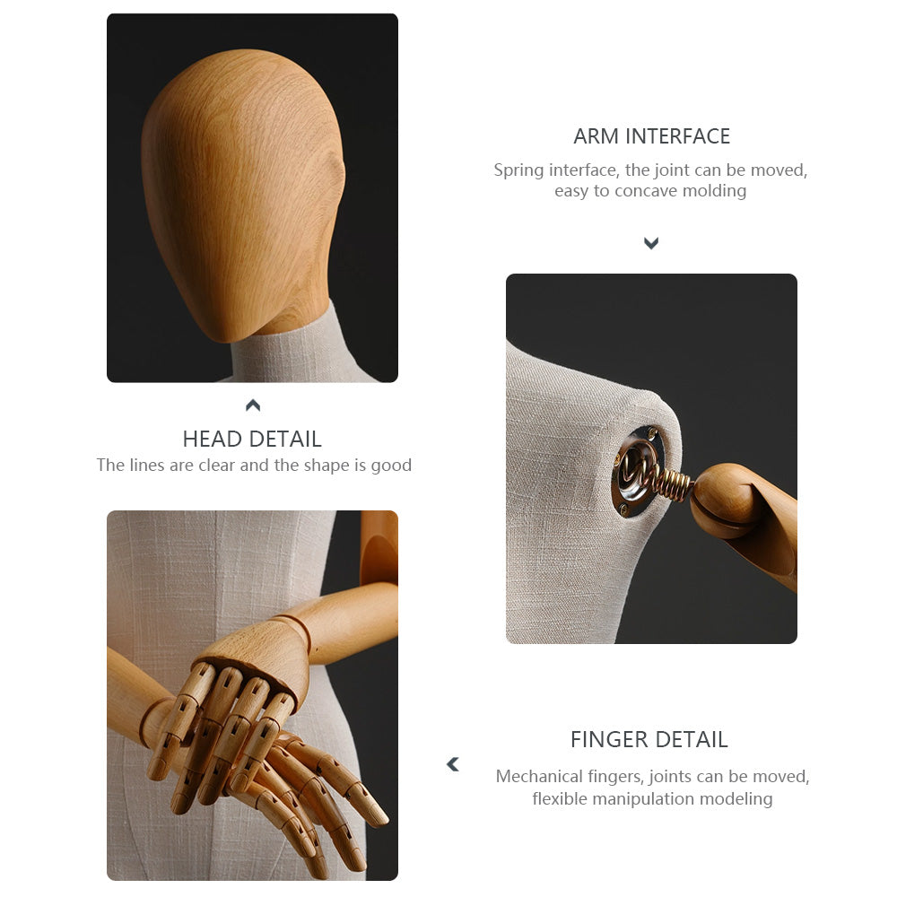 🔥4).Choose between a fabric wrapped head for a seamless look or a wooden head for a modern, artistic feel. These options allow retailers and designers to curate the perfect display setup for their unique brand aesthetic.The high quality wooden hands add a realistic and flexible touch to product displays. Designed with attention to detail, they allow for natural positioning, making it easy to showcase accessories like gloves, watches, and handbags. Supported by a premium silver square base, this mannequin stands with poise and stability. Its sleek, contemporary design blends effortlessly into high-end boutiques, department stores, and luxury retail spaces.