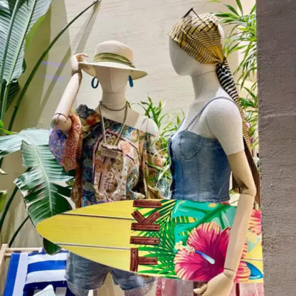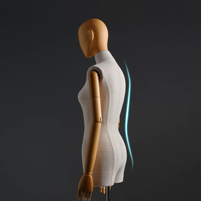 The JMFHB04 high end female half body mannequin is a must-have for boutiques and retail spaces seeking sophistication. Designed with high quality bamboo linen fabric, premium wooden hands, and an option of a fabric wrapped or wooden head, this mannequin seamlessly blends style and durability. Paired with a sleek silver square base, it allows for creative display combinations that highlight apparel and accessories like hats, scarves, jewelry, and more. Its elegant form enhances boutique interiors, storefront displays, and even home décor. Crafted with precision from durable fiberglass, this mannequin is a statement of craftsmanship and luxury. Upgrade your visual merchandising today!