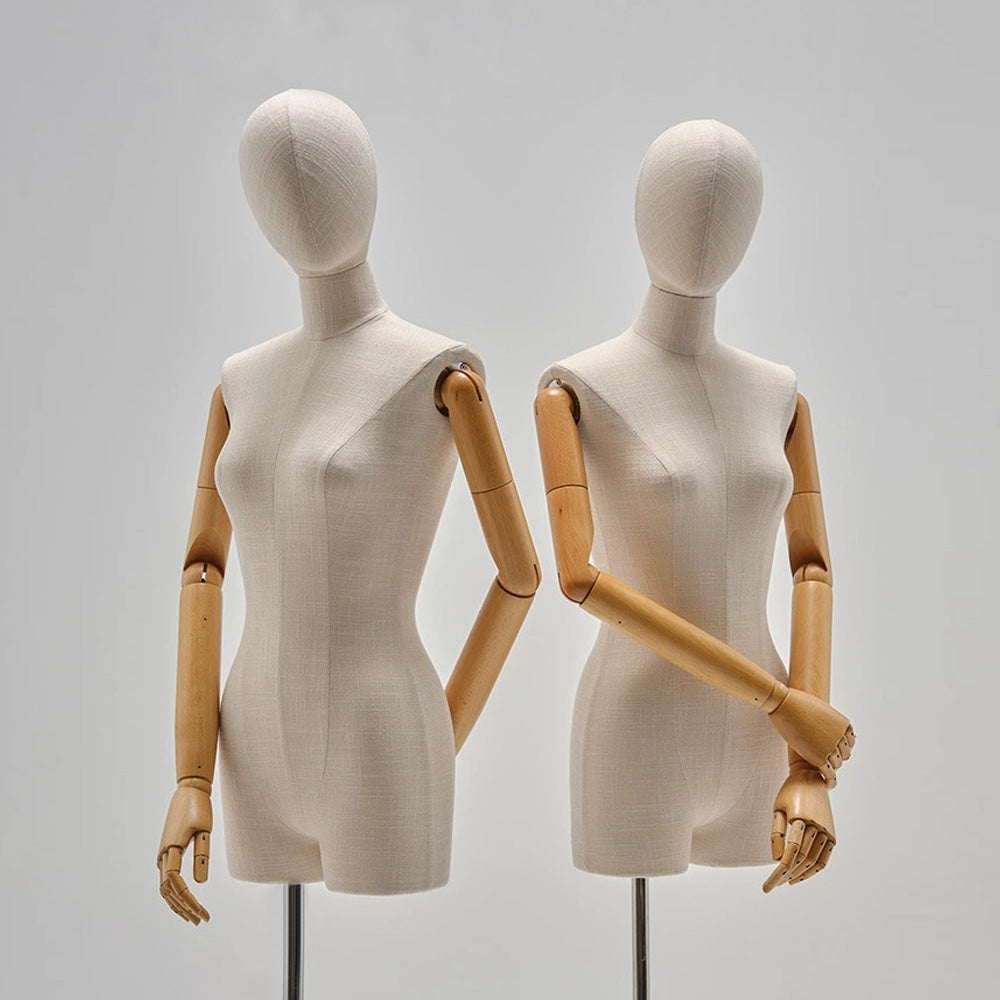 🔥2).Made from high quality fiberglass, this JMFHB04 female half body mannequin is both lightweight and durable, ensuring long-lasting use in high-traffic retail environments. The precision craftsmanship guarantees a smooth and seamless finish, making it a premium choice for professional displays.Wrapped in high end bamboo linen fabric, this mannequin also offers a sophisticated, natural texture that enhances the presentation of clothing and accessories,making it a perfect fit for luxury boutiques and stylish home decor.