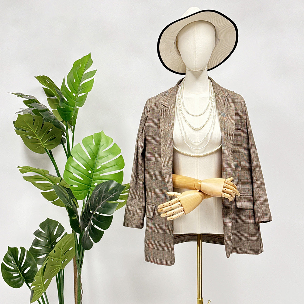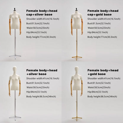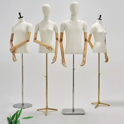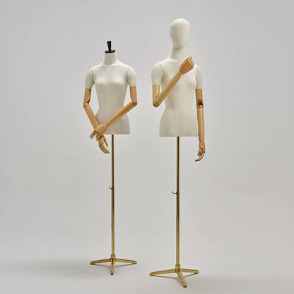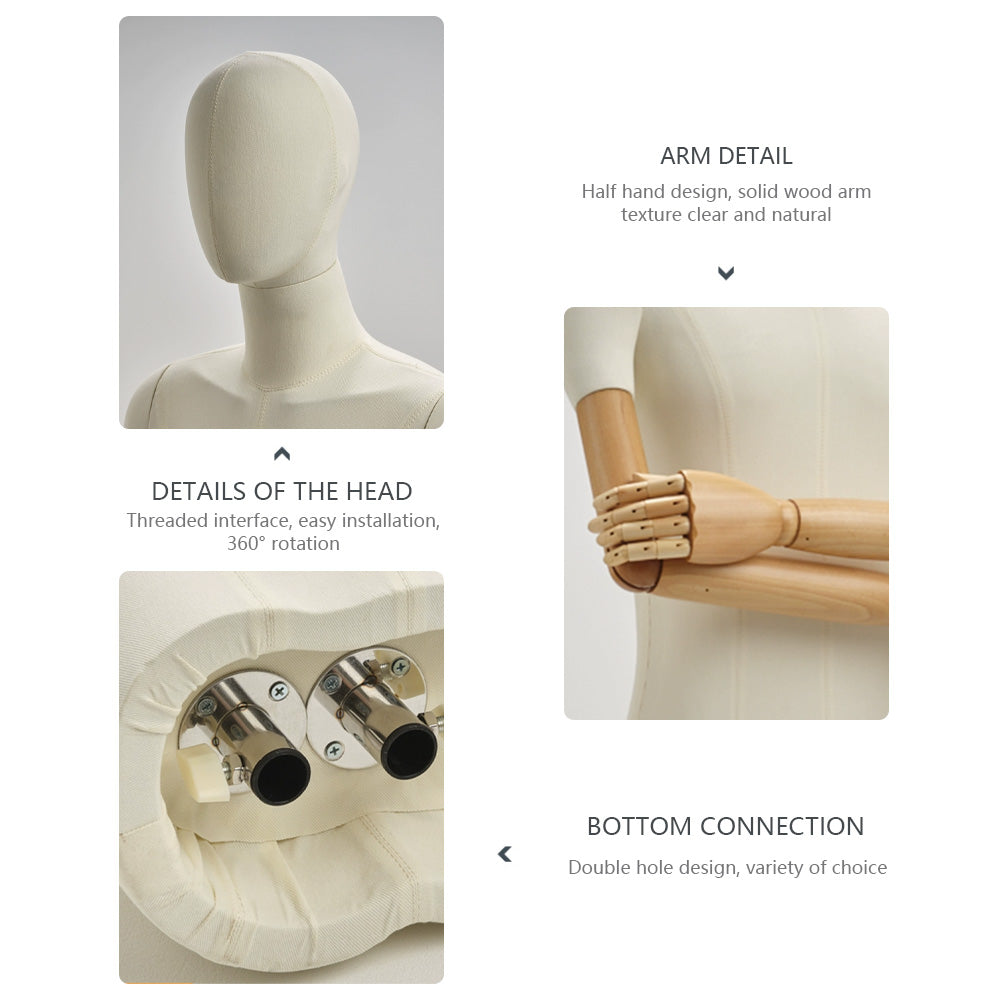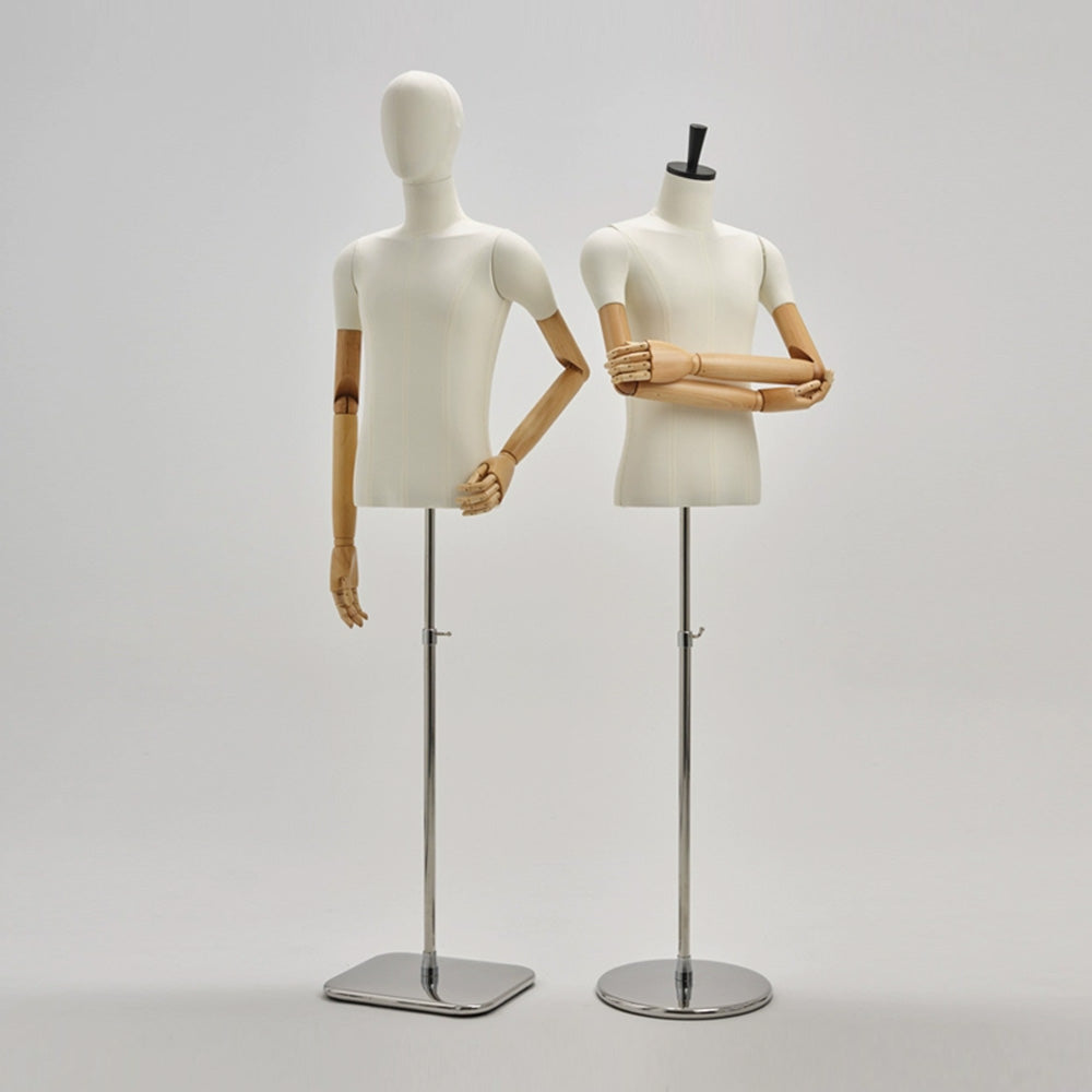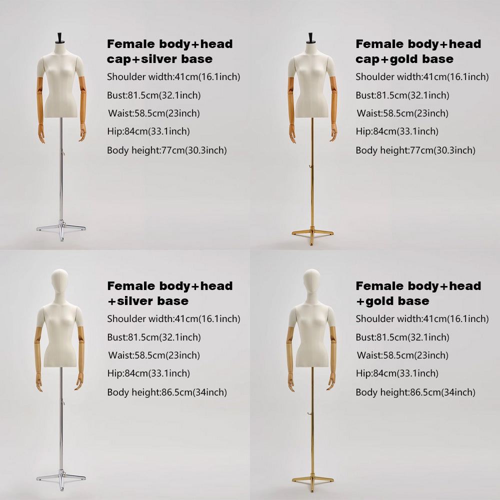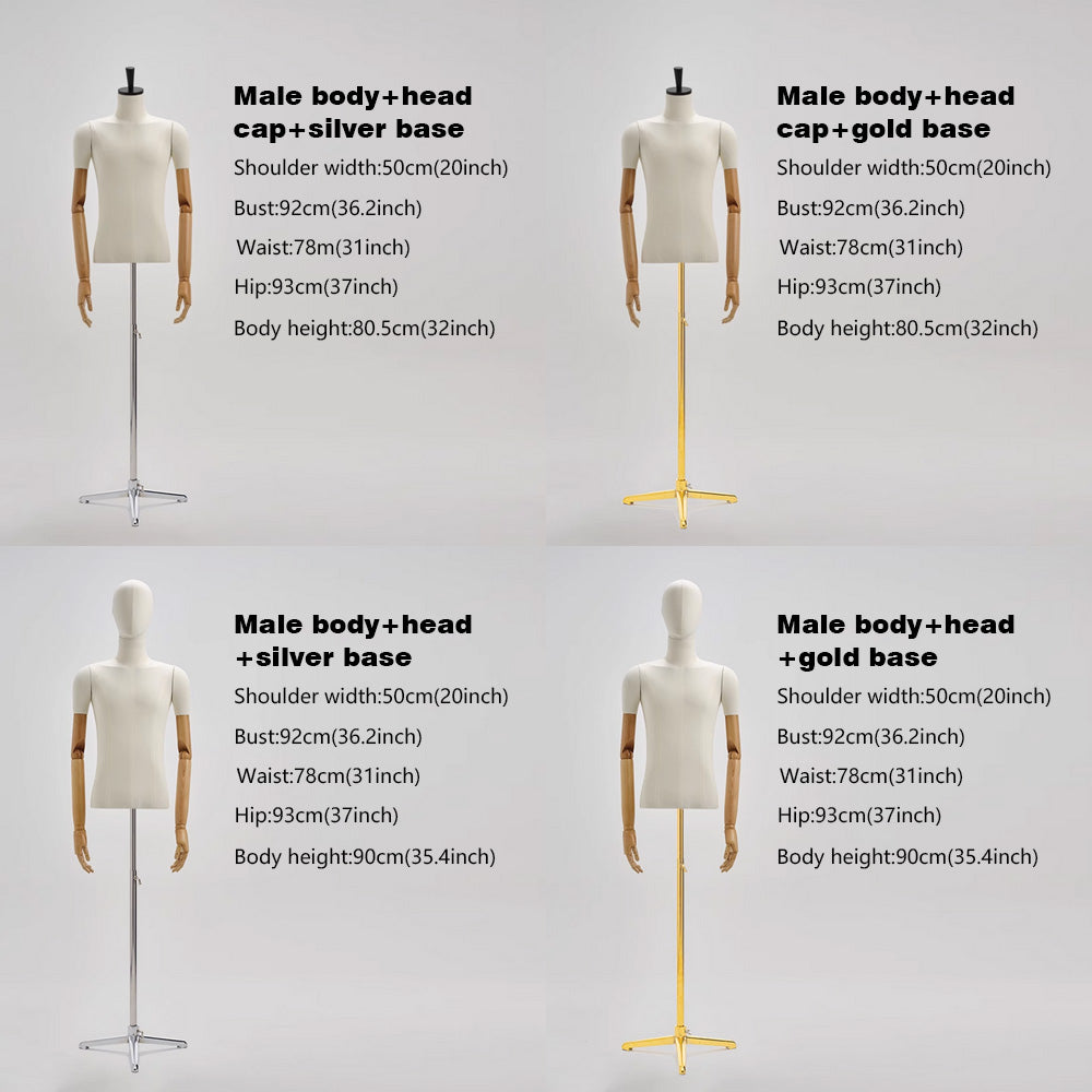 Upgrade your boutique display with these luxurious beige white cotton fabric male and female half body mannequins. Featuring premium wooden hands, these mannequins exude elegance and craftsmanship. Choose between two head options: a sleek fabric covered head for a seamless look or a bold black wooden head cap for a modern touch. Complement your store’s aesthetic with either a silver or gold triangular base. Ideal for showcasing clothing and accessories such as scarves, hats, jewelry, and sunglasses, these mannequins are perfect for creating stunning in-store setups or window displays. Their timeless design and versatility make them a must-have for any upscale retail space, enhancing the overall shopping experience.Also can use it to display your products in a window, on a counter, on a tiered display shelf, or on the floor Ideal for sweaters, T-shirts, jackets, dresses, blouses, tops and accessories.