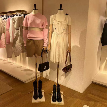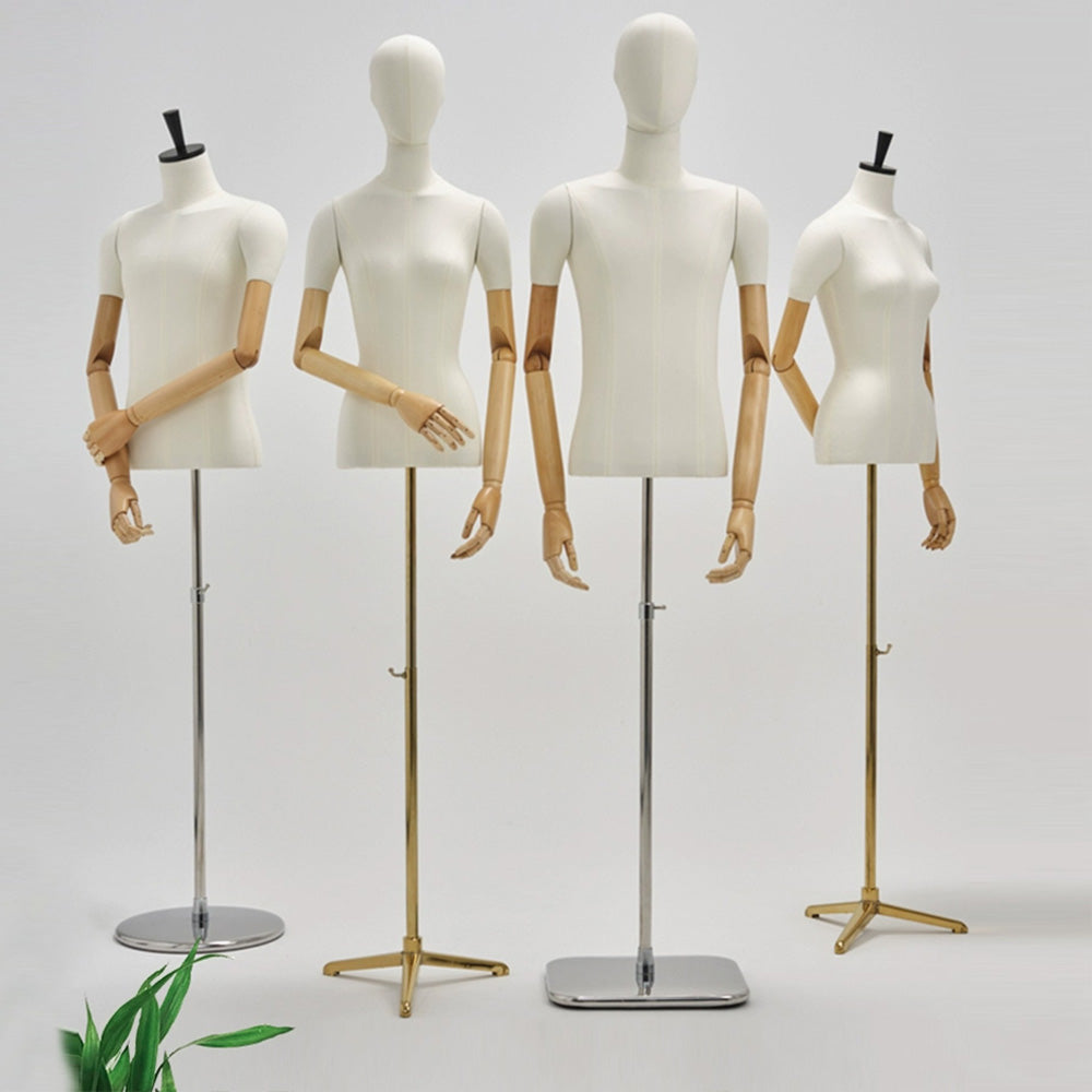 🔥1).Add sophistication to your boutique with our high-end white cotton fabric male and female half-body mannequins. Each mannequin is equipped with premium wooden hands and offers customizable features, including fabric covered heads or black wooden head caps, and a choice of silver or gold triangular stands. These mannequins are perfect for displaying clothing and accessories such as sunglasses, hats, or scarves, whether in store interiors or eye-catching window arrangements. Their clean, modern design blends seamlessly into upscale retail environments, creating a polished look that highlights your merchandise beautifully.