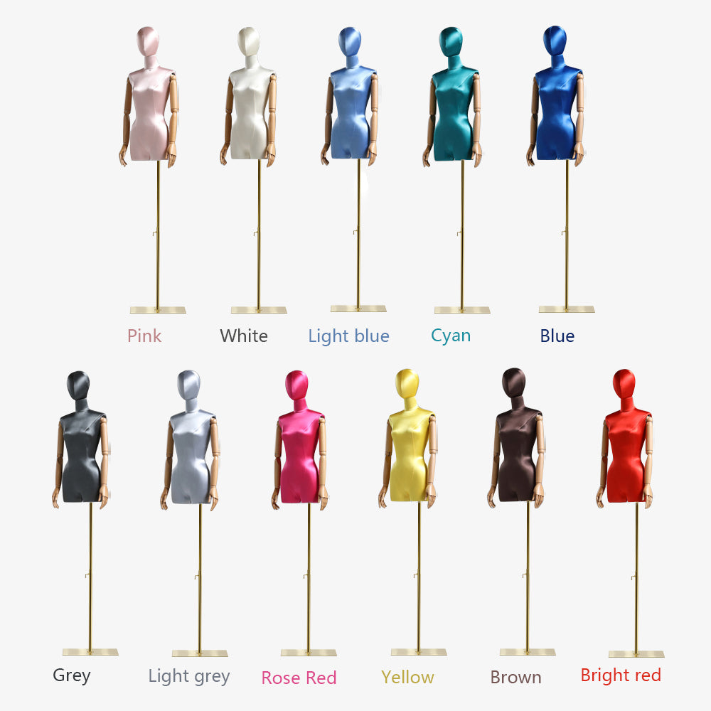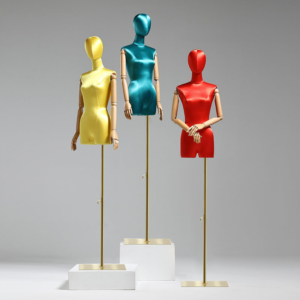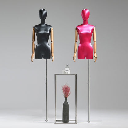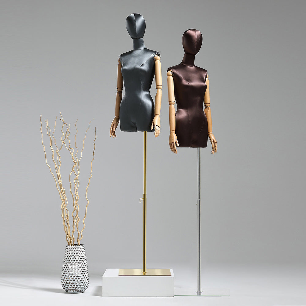 This high end female half body satin mannequin is a must-have for fashion boutique stores looking to display accessories and clothing with elegance. Wrapped in luxurious satin fabric, this mannequin comes with finely crafted wooden hands that add a touch of sophistication to any display. The gold square base provides extra stability while enhancing its overall aesthetic. Available in multiple colors, it allows you to choose the perfect match for your store’s theme. Ideal for showcasing sunglasses, handbags, hats, necklaces, and more, this mannequin is perfect for both in-store displays and window showcases. Elevate your boutique store’s presentation with this versatile, stylish mannequin that draws attention to every detail of your fashion pieces.