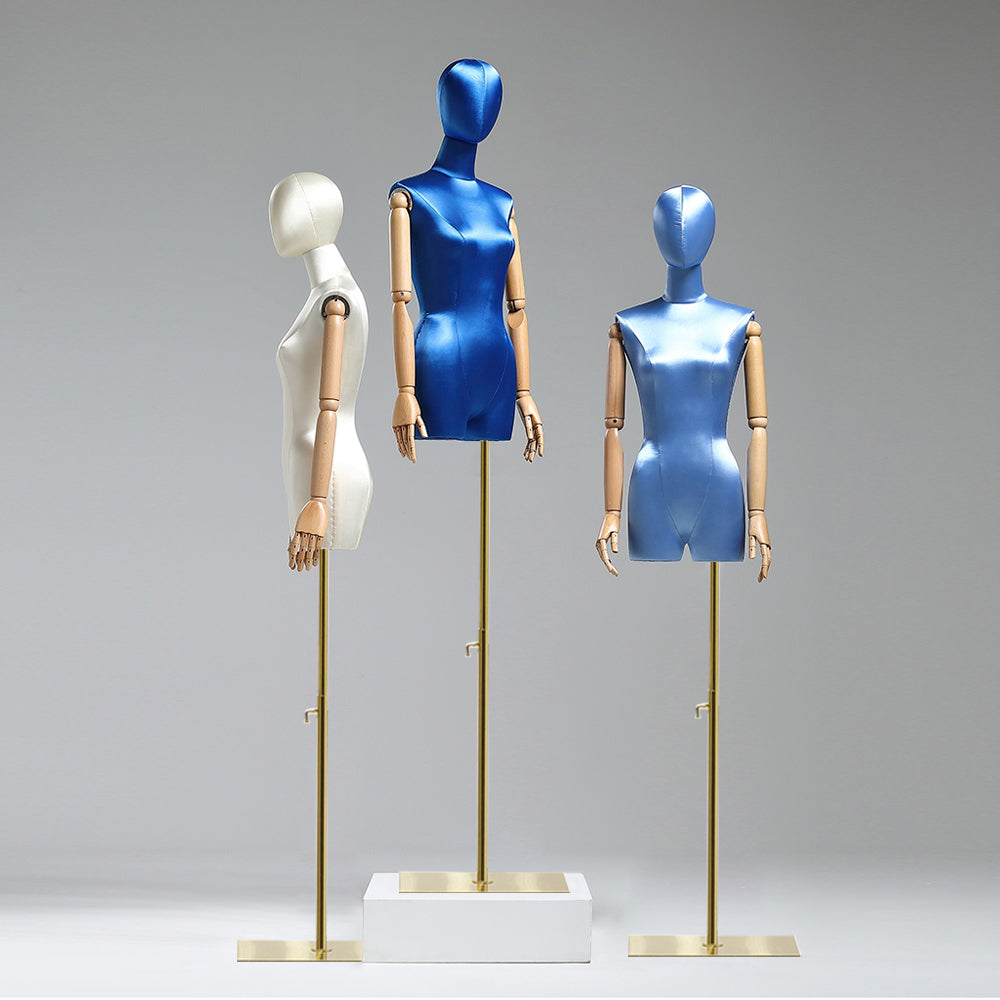 👏4.Drape your accessories and garments on this premium female half-body mannequin, which features a luxurious satin finish. The fabric’s smooth texture reflects light beautifully, adding an upscale aesthetic to your boutique’s display. This mannequin is ideal for high-end fashion shops that want to present products with class and sophistication.Mounted on a chic gold square base, this mannequin combines style and stability. The gold base complements the satin fabric and wooden hands, creating a sleek, modern look that is sure to catch the eye. Its sturdy construction ensures that your mannequin stays in place, even during busy shopping hours or in window displays.