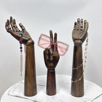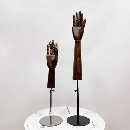 Elevate your boutique store’s accessory display with these exquisite Brown Wooden Mannequin Hands. Offered in three different styles, each hand is crafted from quality wood and finished in a deep brown tone that complements a variety of decor styles. Perfect for displaying sunglasses, rings, and other small accessories, the sturdy metal round base keeps each piece securely positioned. Ideal for both in-store and window displays, these mannequin hands add a luxurious touch that draws customers’ attention and showcases products beautifully. With their versatile, timeless design, they’re a must-have for creating eye-catching boutique displays.This item is great for holding or displaying rings, necklace,sunglasses,shoes,bags,hats,cosmetic ,makeups,chains, watches and scarves, along with other jewelry and fashion accessories. Wonderful accent piece for any home decor or retail display or store display!