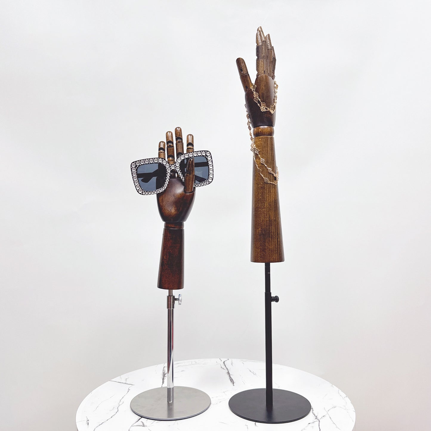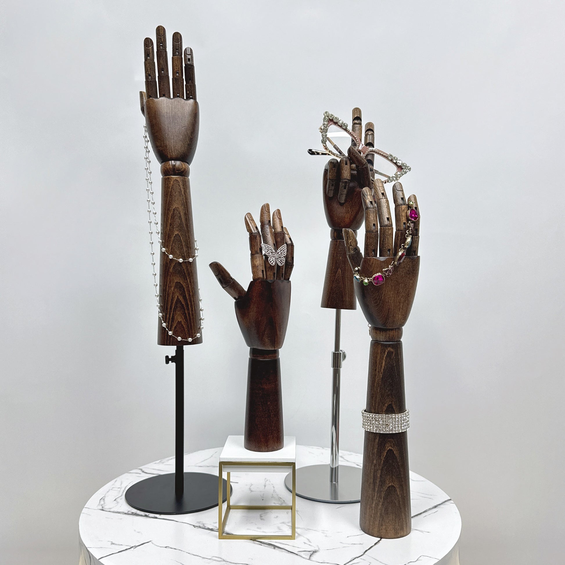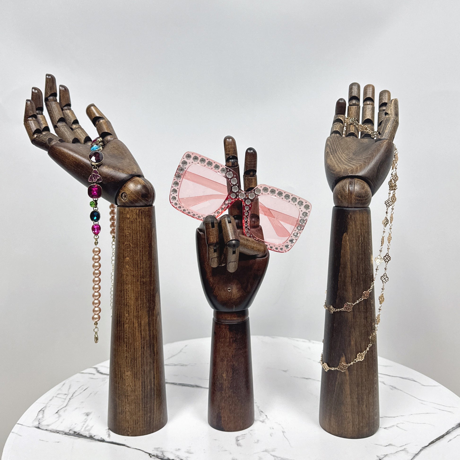 👏1).Showcase your accessories with elegance using our Brown Wooden Mannequin Display Hands. Available in three style options, these hands are crafted from high quality solid wood, making them perfect for holding jewelry and eyewear in a stylish, eye-catching way. The polished metal round base adds stability and a touch of modern sophistication, making these display hands suitable for both store decor and prominent window displays. They’re an ideal choice for boutiques that wish to highlight accessories with sophistication and warmth. Add these to your display to give each accessory its own spotlight, inviting customers to experience the beauty of every detail.