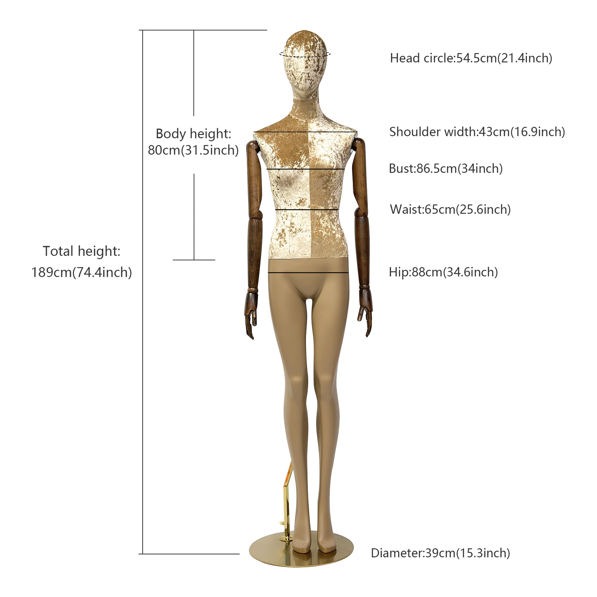 💖Female Full Body Mannequin : Head Circle : 54.5 cm(21.4inch),Shoulder Width :  43 cm (16.9inch),Bust : 86.5 cm (34 inch),Waist : 65 cm (25.6 inch),Hip : 88 cm  (34.6 inch),Body Height : 80 cm (31.5 inch),Total Height :189 cm (74.4 inch),Base Diameter :  39cm (15.3 inch).