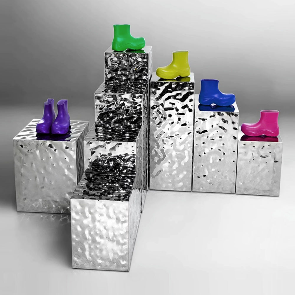 The product is boutique clothing store mannequin display stand shoes bag shelf silver mannequin stool,the design are very modern and fashion, this stool style is suit for light luxury style,european and usa style and leisure style,the stool have different shape and different size for u chioce and meet your different require,use it to dress up your store can grab customer's attention,use it to dress up your window can make your window become more outstanding and gorgeous,use it to dress up your works can present perfect display effect, also can use it to display your products in the window, on the trade show, on the fashion school, or on the clothing boutique store,Ideal for display bags,shoes and mannequin.