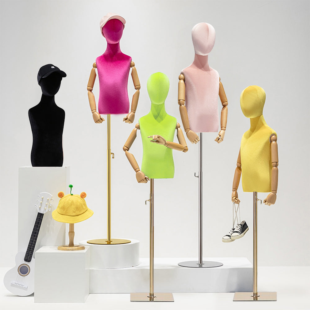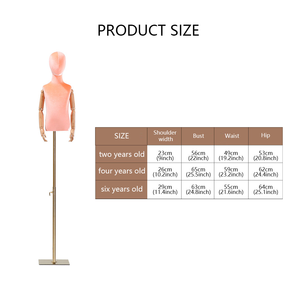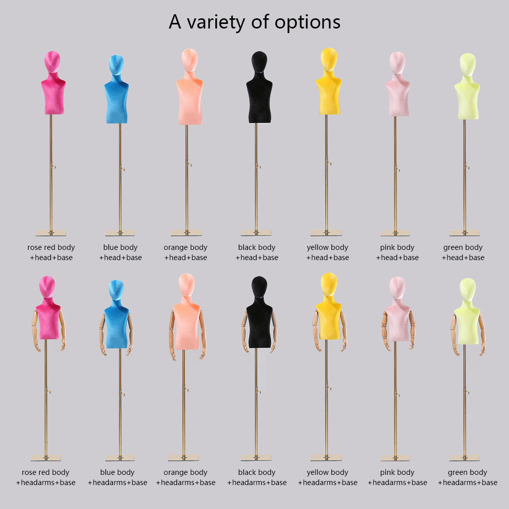 Elevate your children store displays with this premium kid half body mannequin, designed for exceptional quality and style. This mannequin have 2 years old, 4 years old and 6 year olds three sizes for u chioces and features finely crafted wooden hands and a gold square base, adding a luxurious touch to any display. Made from durable plastic with meticulous craftsmanship, this mannequin is perfect for showcasing children clothing and clothing accessories such as hats,headphone,headband,scarf,jewelry and more.With a variety of colors to choose from, you can match the mannequin to your store’s theme or create a standout display in your boutique or window showcase. Ideal for children's clothing shops, boutique displays, or as a unique home decor piece, this mannequin is a versatile addition to any space.It also can use it to display your products in a window, on a counter, on a tiered display shelf, or on the floor.