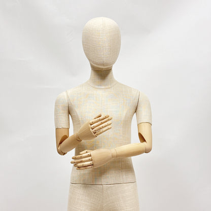 The torso is wrapped in high-quality bamboo linen fabric, offering a soft, eco-friendly, and textured surface. The neutral tone complements any clothing style and enhances the overall display aesthetic.