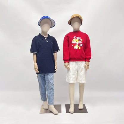 This kids mannequin features a standing full body structure, providing a realistic child-sized silhouette ideal for displaying entire outfits, from tops to shoes. Perfect for use in boutiques, shop windows, and retail displays.