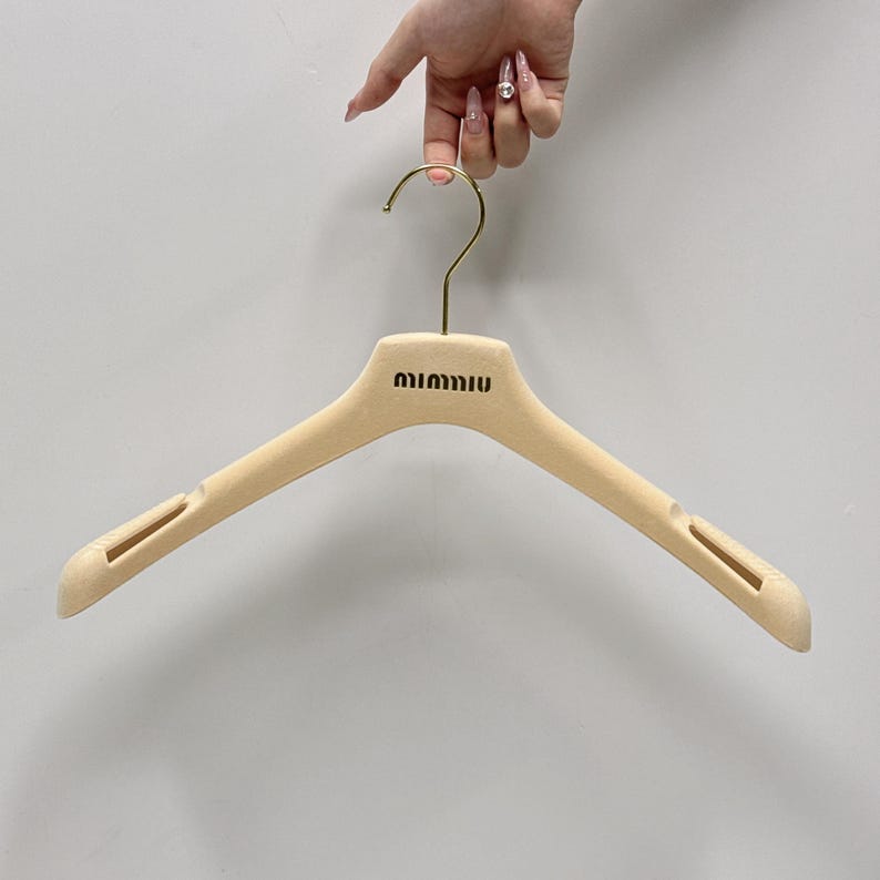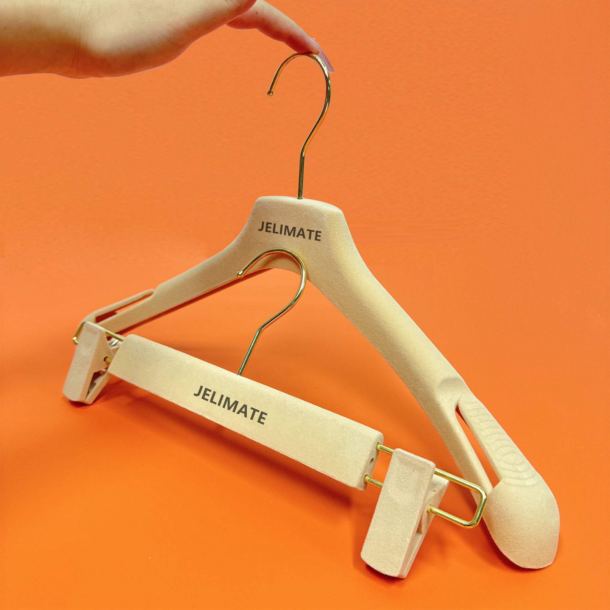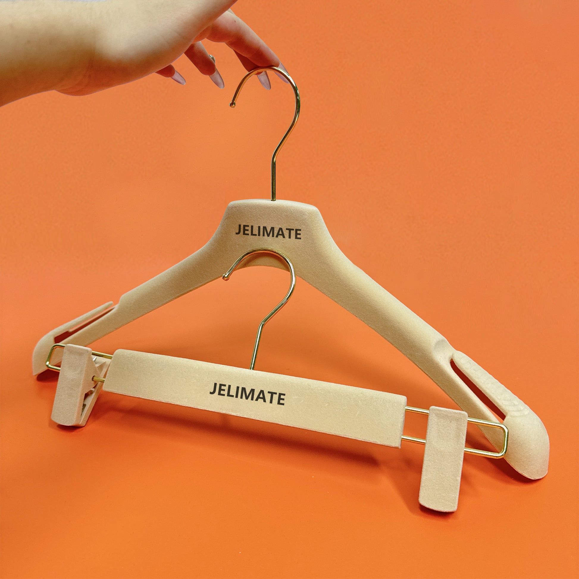 Jelimate Luxury Flocking Velvet Hanger,Beige Velvet Clothing Hanger/Pant Hanger,Hollow Shoulder Gold Hook Non Slip Flocking Plastic Hanger,Custom Logo Velvet Dress Hangers,Clothing Store Skirt Shirt Suit Hanger Space Saving Clothes Hangers