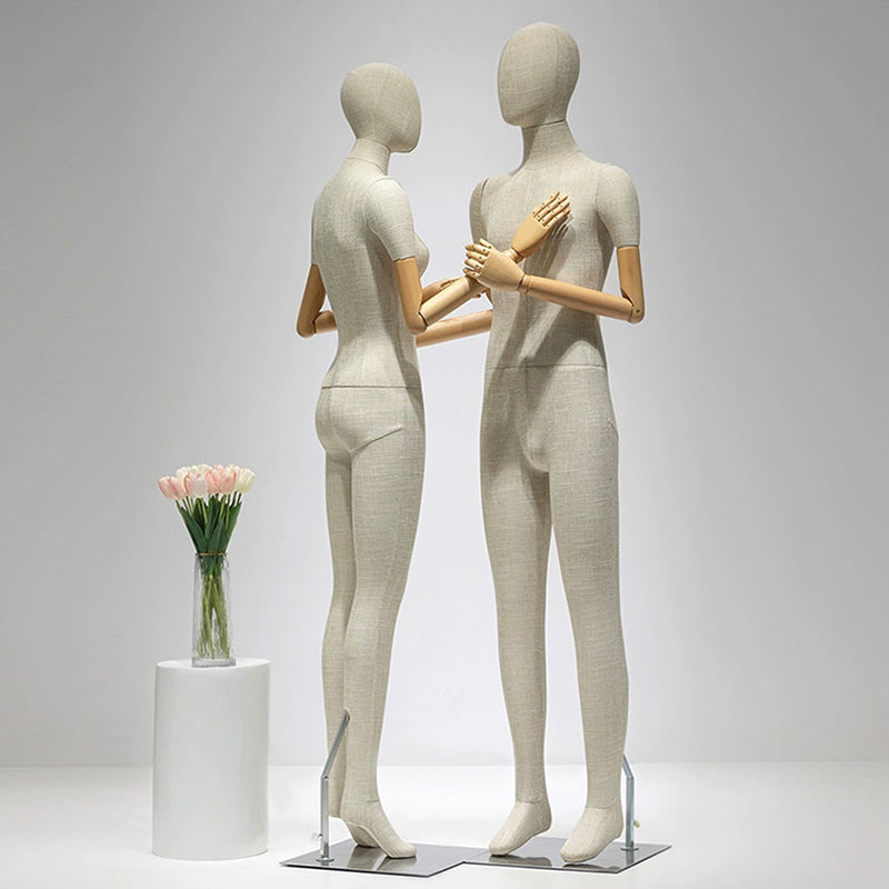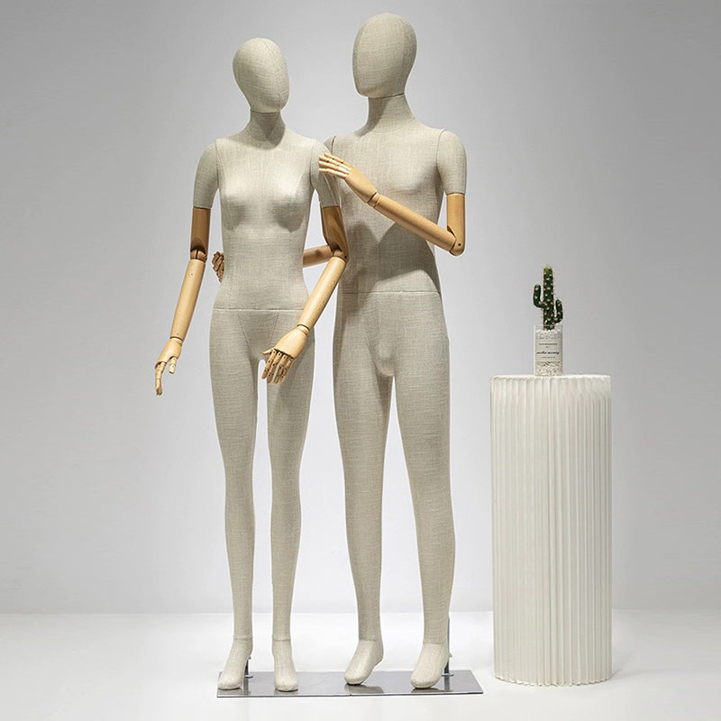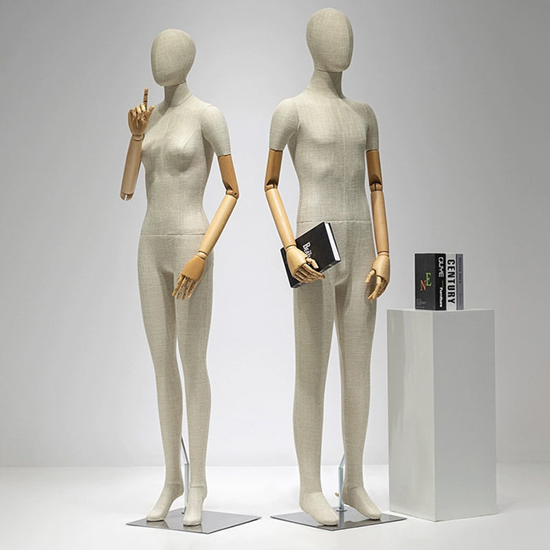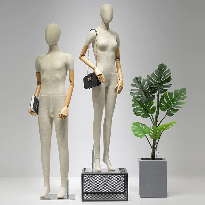 Transform your retail space with our Premium Full-Body Mannequins. Meticulously designed for upscale boutiques, these mannequins are crafted from high-durability fiberglass and hand-wrapped in sophisticated grey bamboo linen. Featuring articulated wooden arms and a sleek silver square base, they offer the perfect canvas to showcase luxury fashion, jewelry, and accessories. Whether utilized in high-traffic retail environments or as a statement piece in modern home decor, these figures provide a refined, tactile experience that captivates customers.