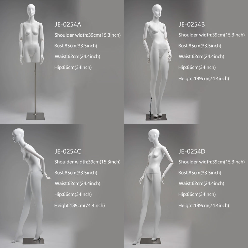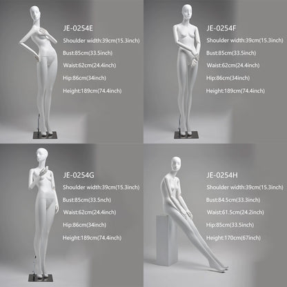 - JE-0254B-G (Standing Full Body): Shoulder Width: 39 cm (15.3"), Bust: 85 cm (33.5"), Waist: 62 cm (24.4"), Hip: 86 cm (34"), Height: 189 cm (74.4")