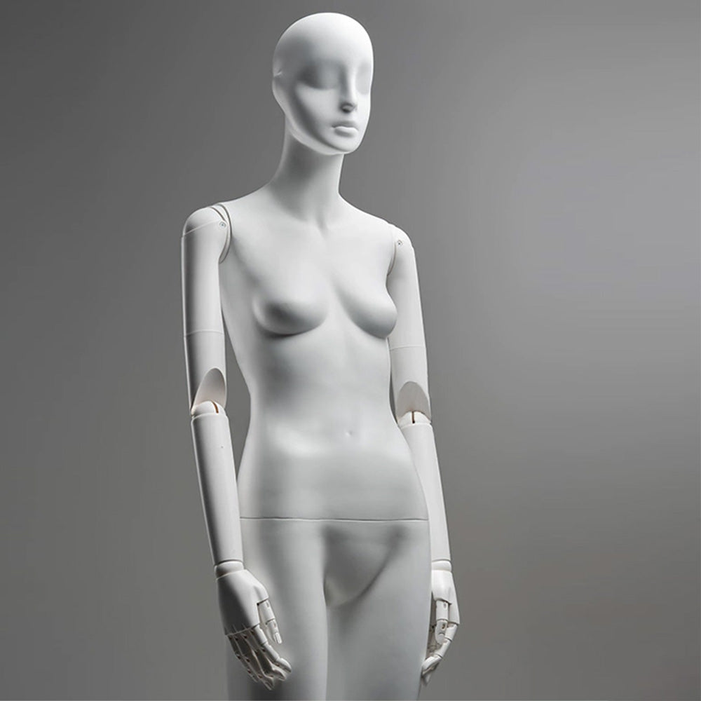 Our Abstract Mannequin Series offers modern clothing display props for elevated window display and retail store fixtures. Featuring abstracted facial forms, this matte white fiberglass model simplifies the shape, focusing attention entirely on your apparel and jewelry. Available in standing, seated, and half body options, they bring minimalist sophistication and reliable stability to any environment.