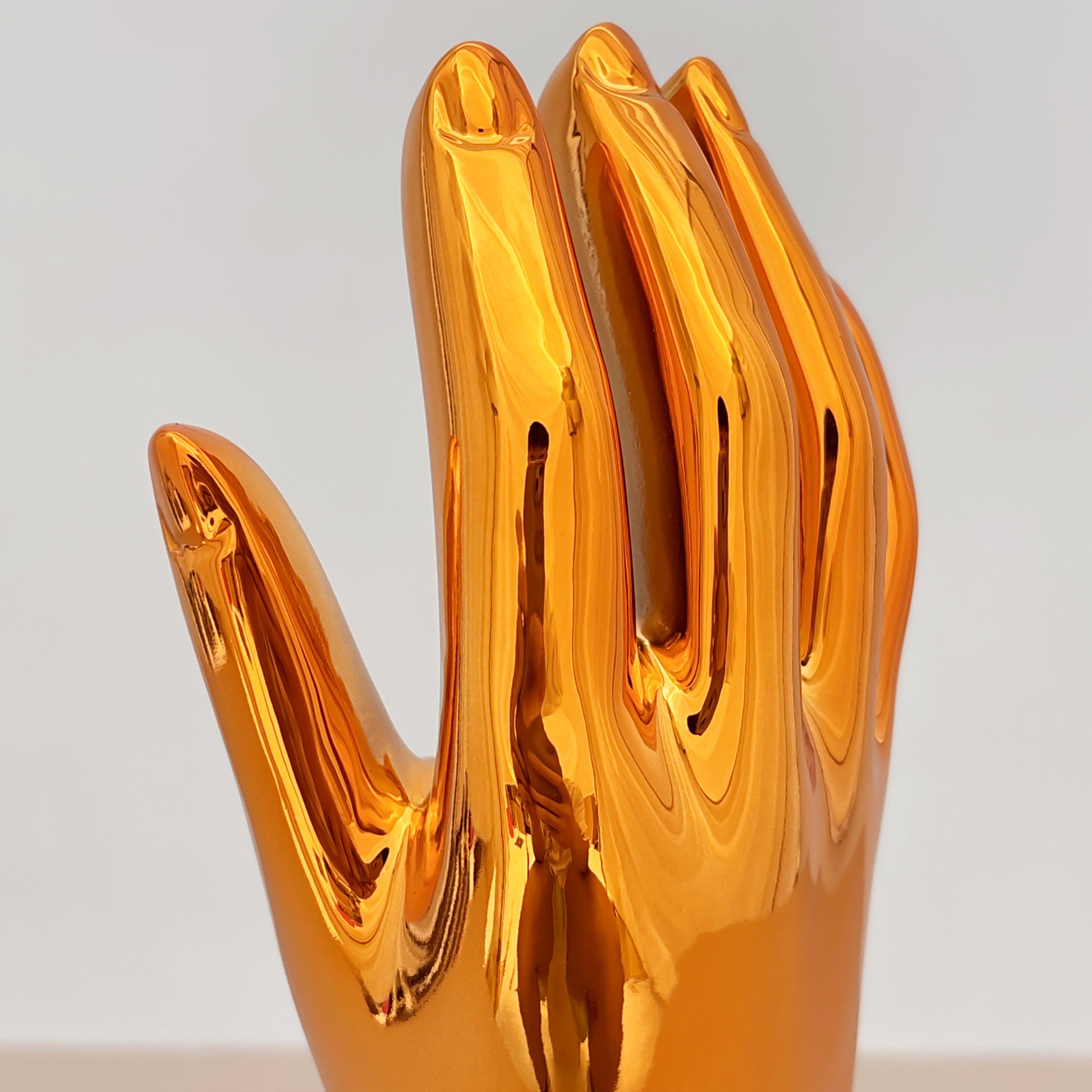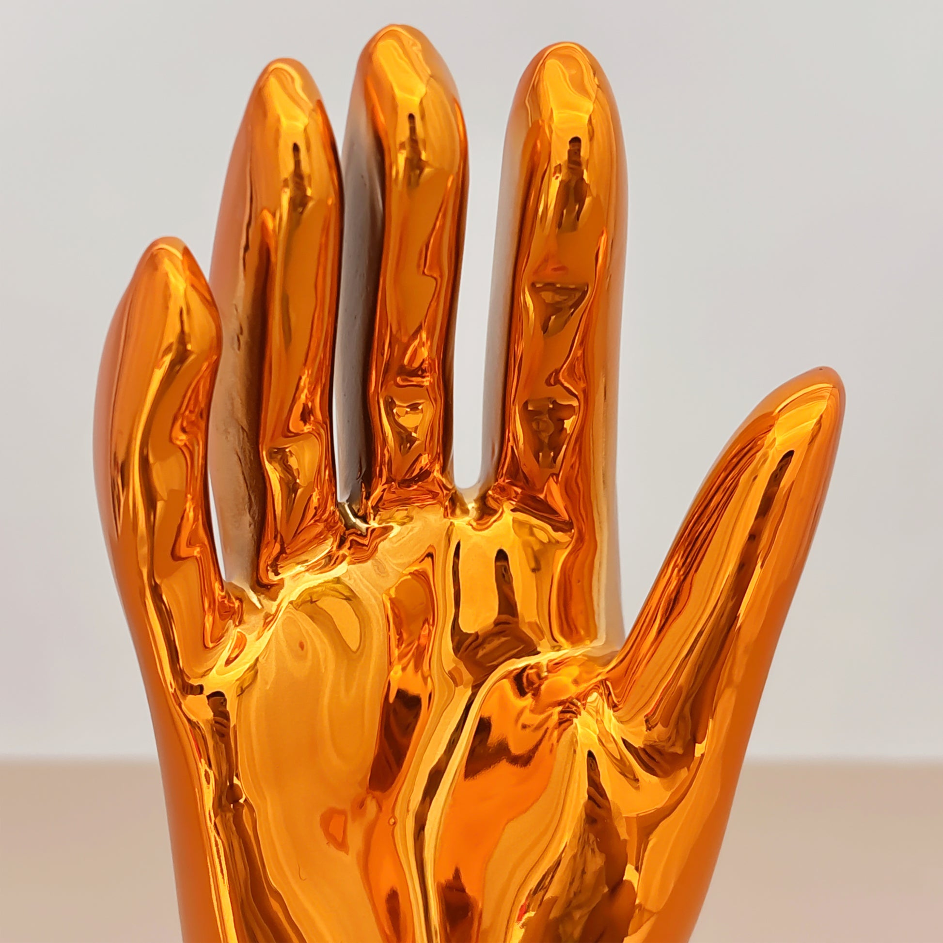 This plated right hand full arm mannequin is elegant rose gold and silver in color with a glossy finish that shines through to the back of the product like a mirror, and can add a touch of luxury and high-gloss glamour to any jewelry or accessory display.