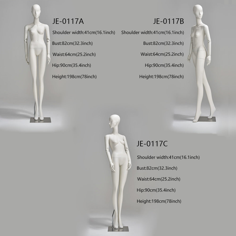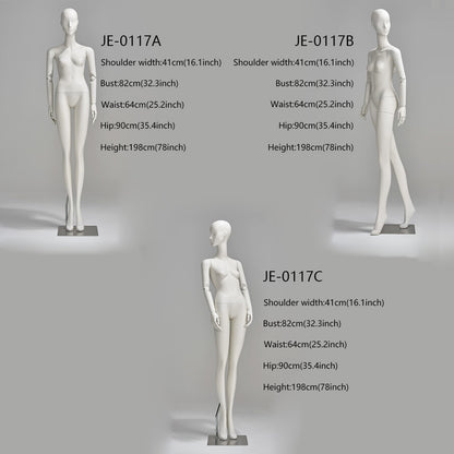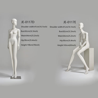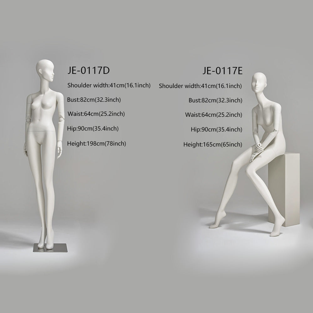 Create limitless styling possibilities with our JE0117 high end female full body mannequins, designed to bring stunning to any clothing boutique stores. Available in five variations—four standing poses female full body mannequins with silver square bases and one seated pose female full body mannequin with a matching stool—each mannequin features premium wooden hands for added refinement. Made from durable fiberglass with an elegant finish, they offer endless creative combinations for showcasing apparel and accessories like jewelry, hats, scarves, sunglasses, and more. Perfect for retail stores, window displays, and even home décor, these mannequins highlight your products beautifully while enhancing the overall ambiance of your space.